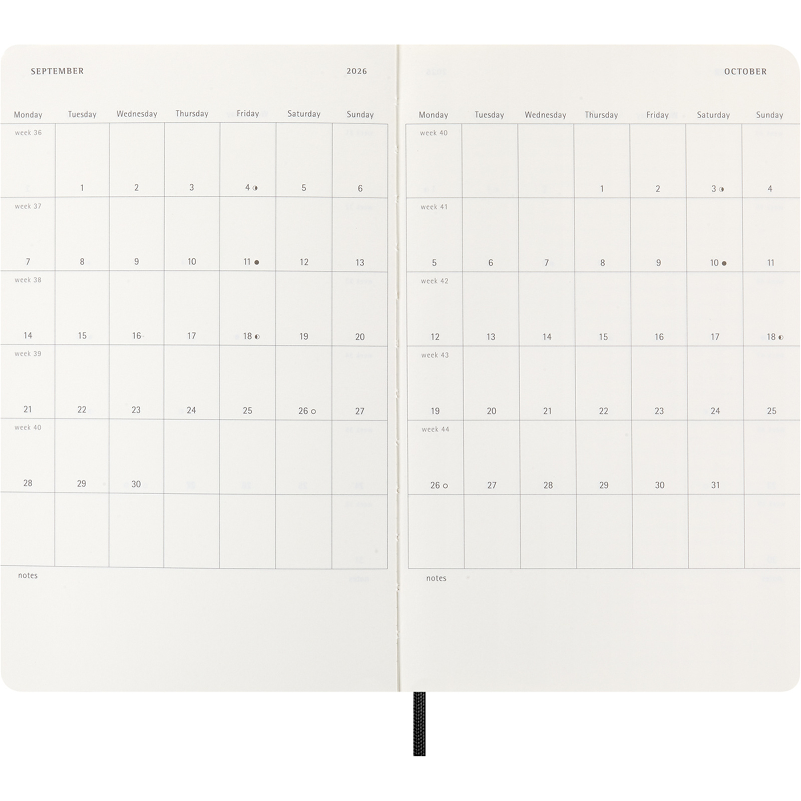 The Moleskine 12 Month Weekly + Notes Soft Cover Large Diary is designed for those who value order and efficiency in their daily lives. Spanning from January to December 2026, this diary ensures users never miss an important date or appointment. Its elegant soft cover is debossed with the year for quick recognition and a polished look, making it both practical and stylish to carry throughout the year.