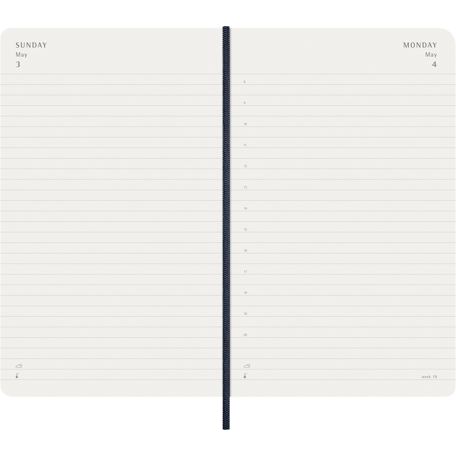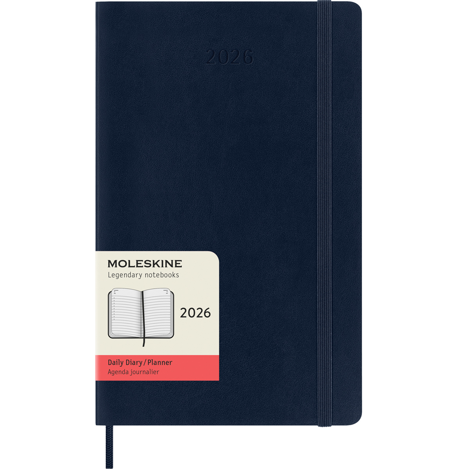 The Moleskine 12 Month Daily Soft Cover Large Diary for 2026 combines classic style with practical features for everyday use. Characterized by its soft cover, this diary exudes professionalism and durability. Its design is enhanced by rounded corners, an elastic closure for secure storage, and a matching ribbon bookmark that adds a touch of sophistication while keeping your place within the planner.