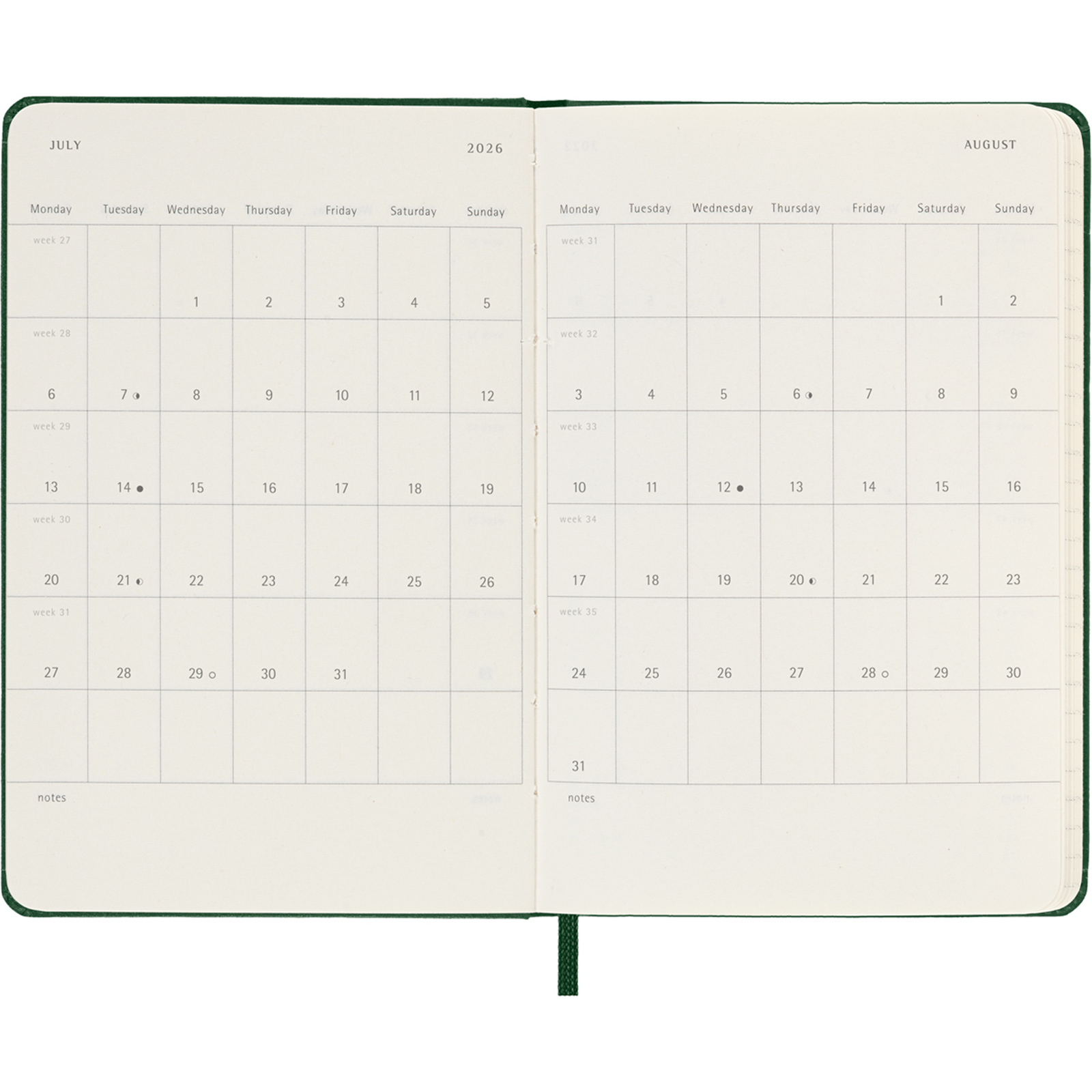 The Moleskine 12 Month Daily Hard Cover Pocket Diary for 2026 brings together refined aesthetics and unmatched convenience. With a hard cover that features the year debossed on the front and comes in a myrtle green hue, this diary is as stylish as it is durable. Its compact, pocket-size dimensions make it easy to carry, enabling you to have your daily planner at hand wherever you go.