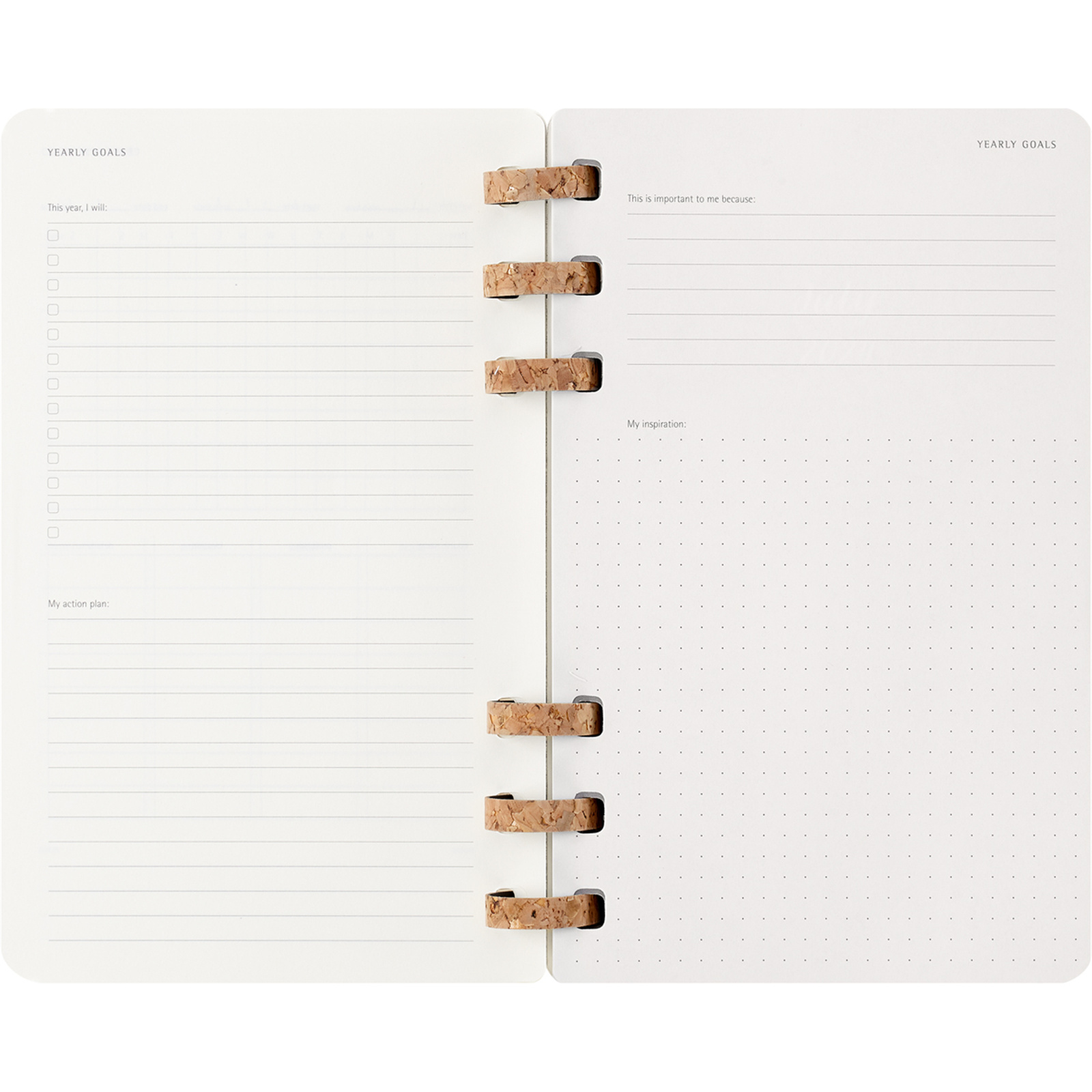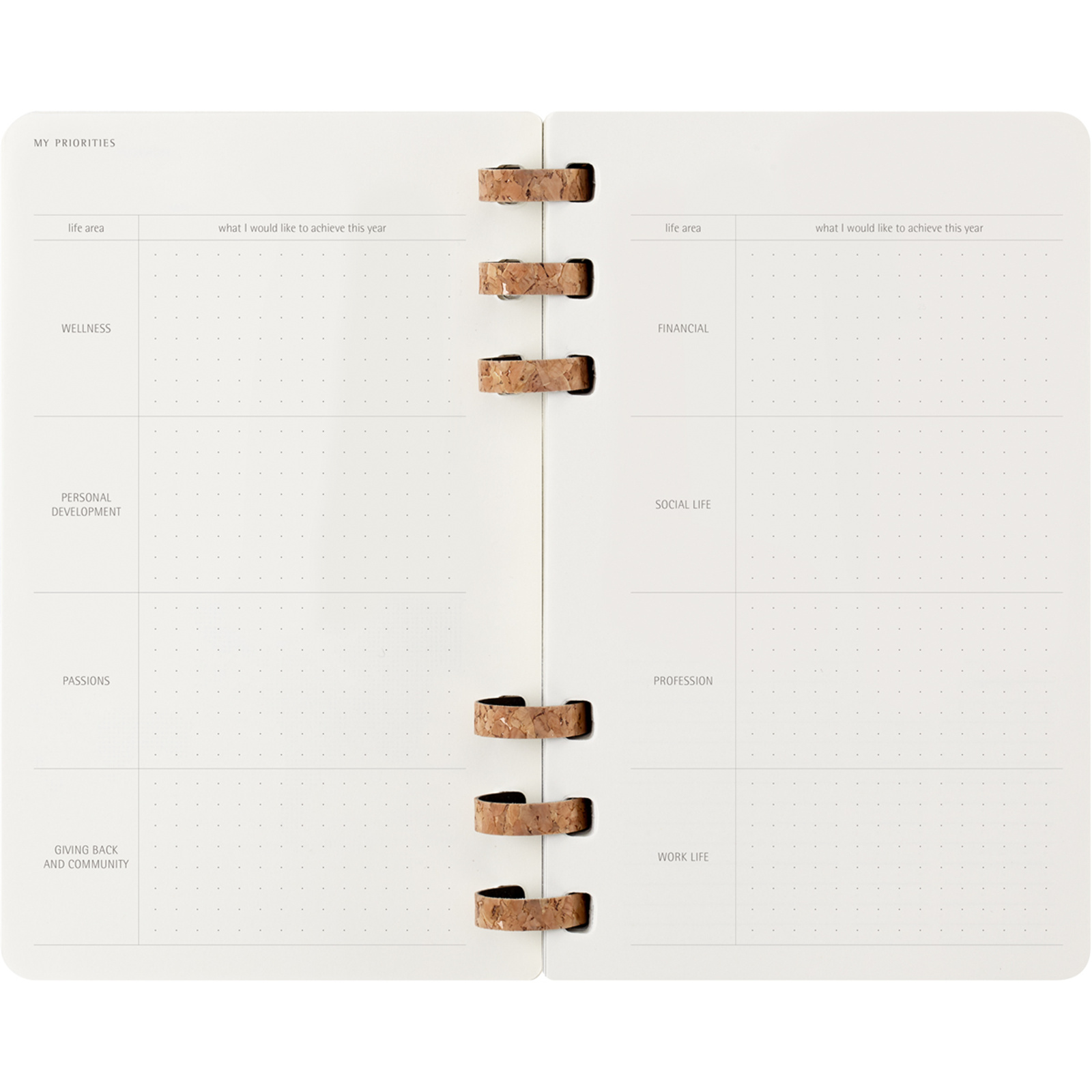 A unique highlight of this planner is its sturdy yet flexible cork-mix spiral binding, which provides resilience while maintaining ease of use. The spiral format allows the planner to lay perfectly flat or be folded back for comfortable writing on any surface. Its soft cover, rounded corners, and secure elastic closure further enhance portability and durability, making it perfect for on-the-go organization.