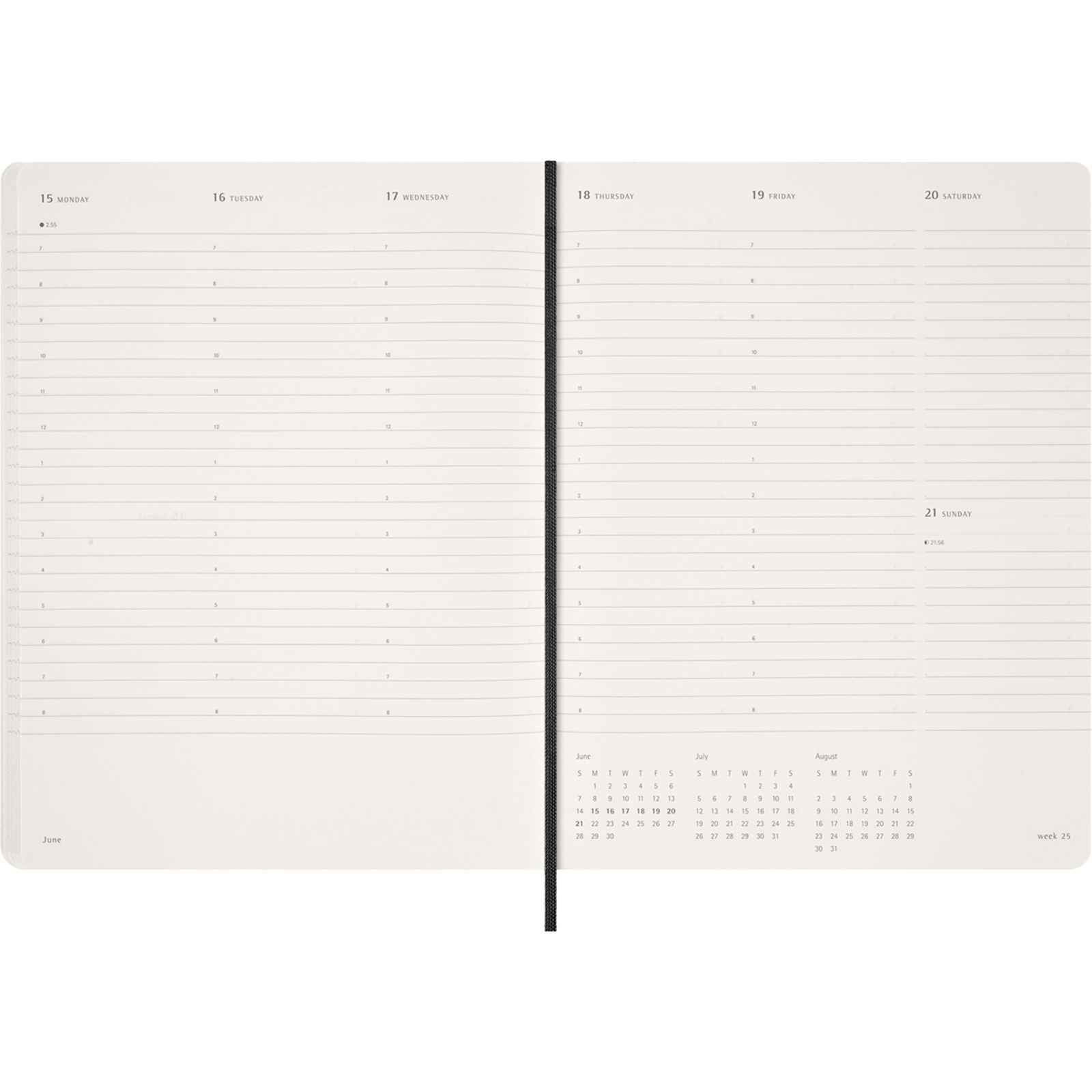 Rounded corners, 180° flat opening, personal info pages, yearly overview, blank pages for notes