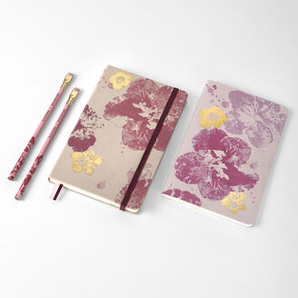 Capture fleeting thoughts with this comprehensive toolkit for the restless genius in your life. Each cover features print of cherry blossoms and gold debossing, inspired by the Japanese traditional gyotaku technique that imprints real natural elements with ink on paper. Peep the back pocket for extra goodies.
