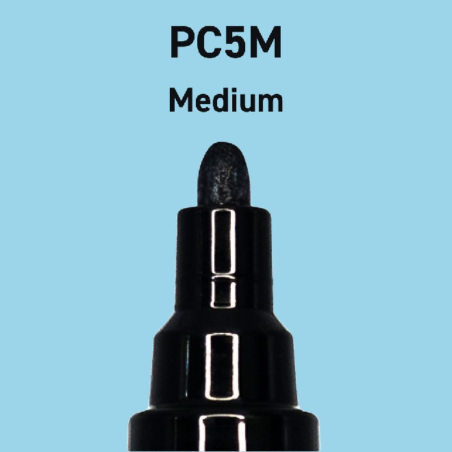 The PC-5M markers feature a medium bullet-shaped tip, measuring approx. 2.5mm in width. This design allows for controlled and precise application, enabling users to create both fine lines and bold strokes effortlessly. The bullet tip makes these markers ideal for detailed illustrations, coloring, adding highlights, or working with intricate designs.