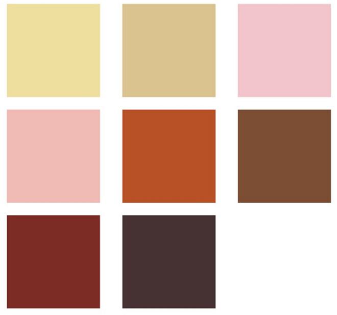 Ivory, Beige, Satin Pink, Powder Pink, Chestnut, Brown, Cacao Brown, and Dark Brown