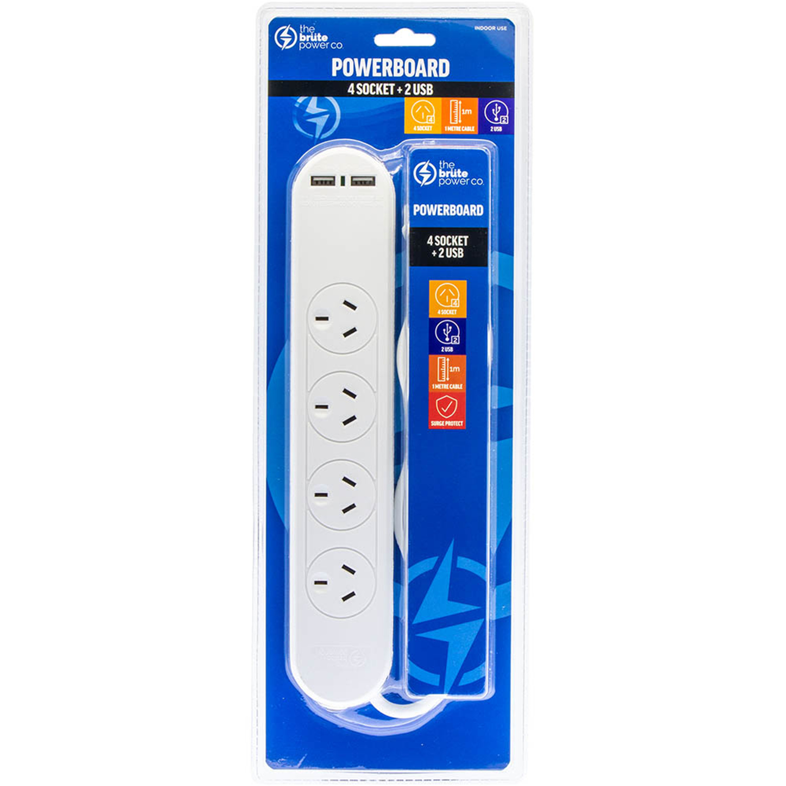 The Brute Power Co BPPB4USB2 4 Socket Powerboard - 2 USB + 1 Switch - 1m Cord SAA Approved
