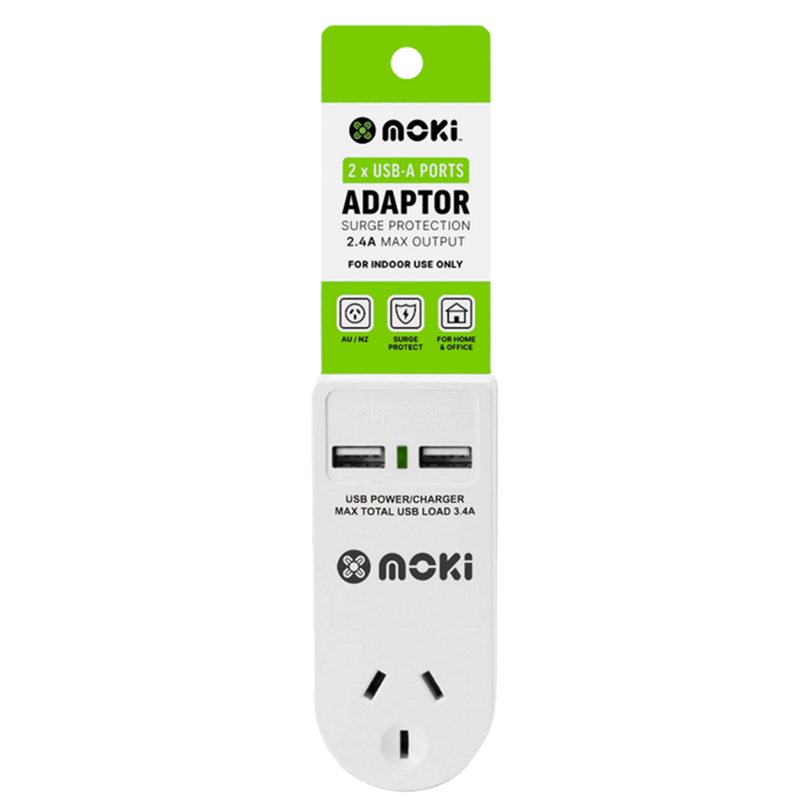 The Moki Adaptor + USB-A is surge-protected with a max output of 2.4A and comes with either 2 or 4 USB-A ports and a single socket. For indoor use only-perfect for in the home and office.