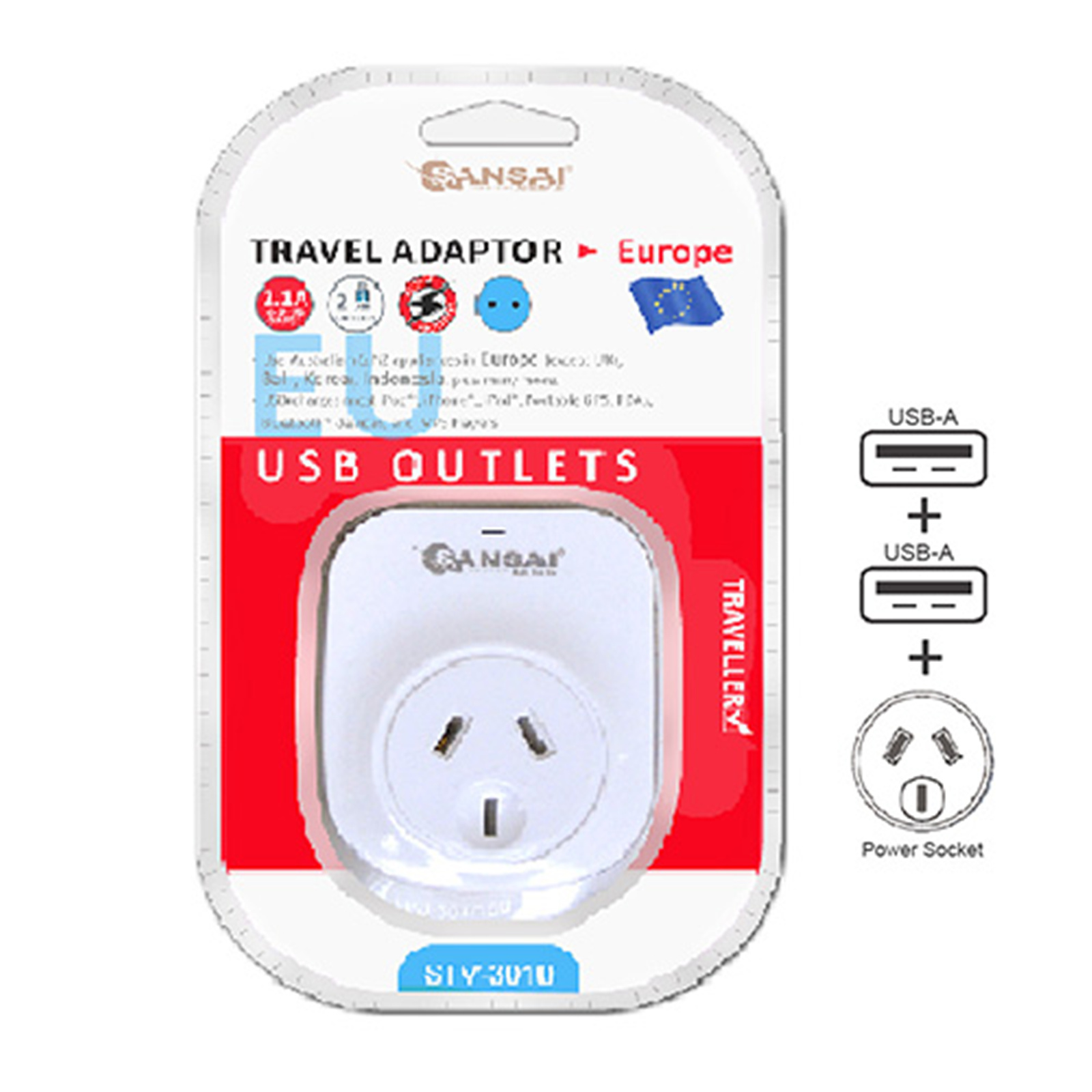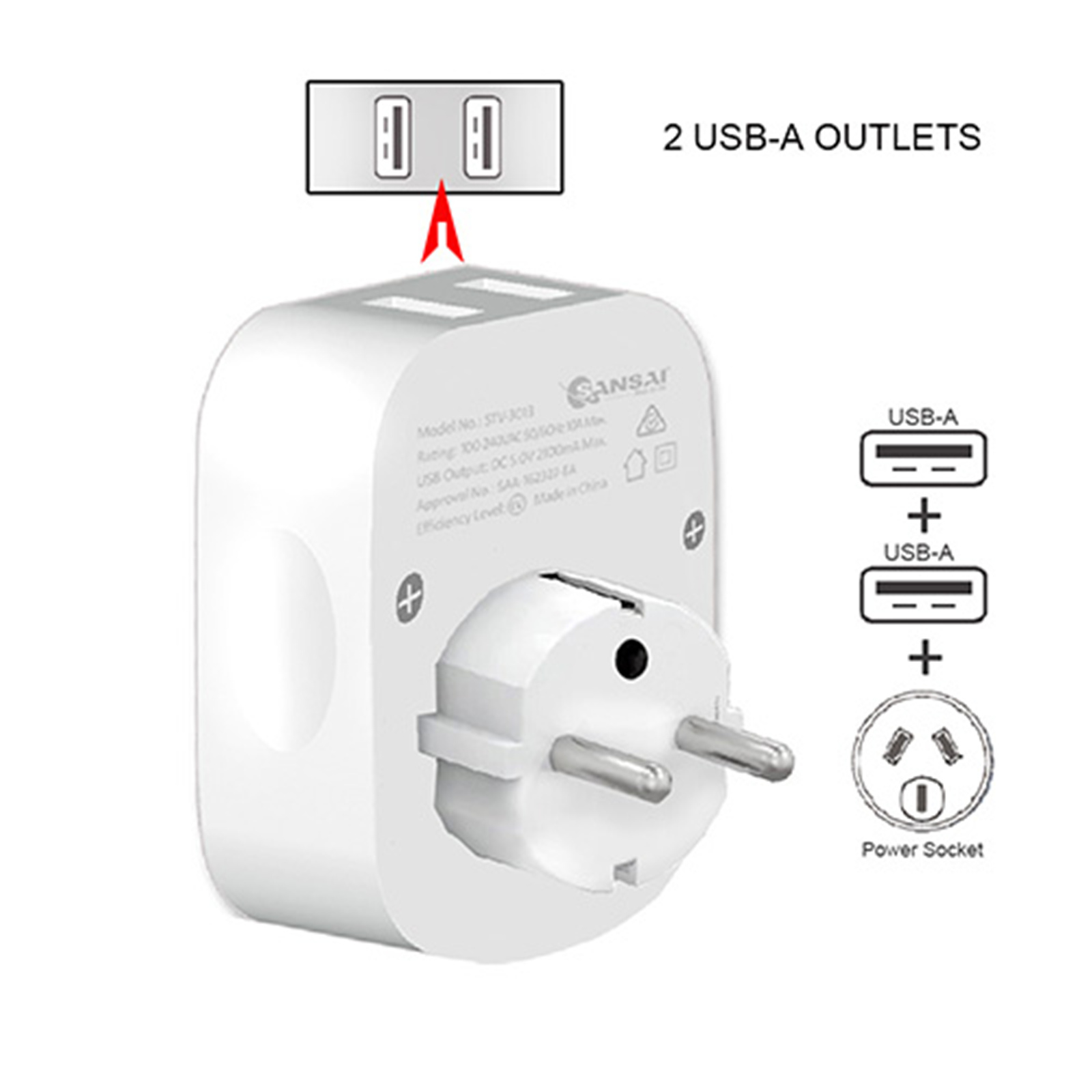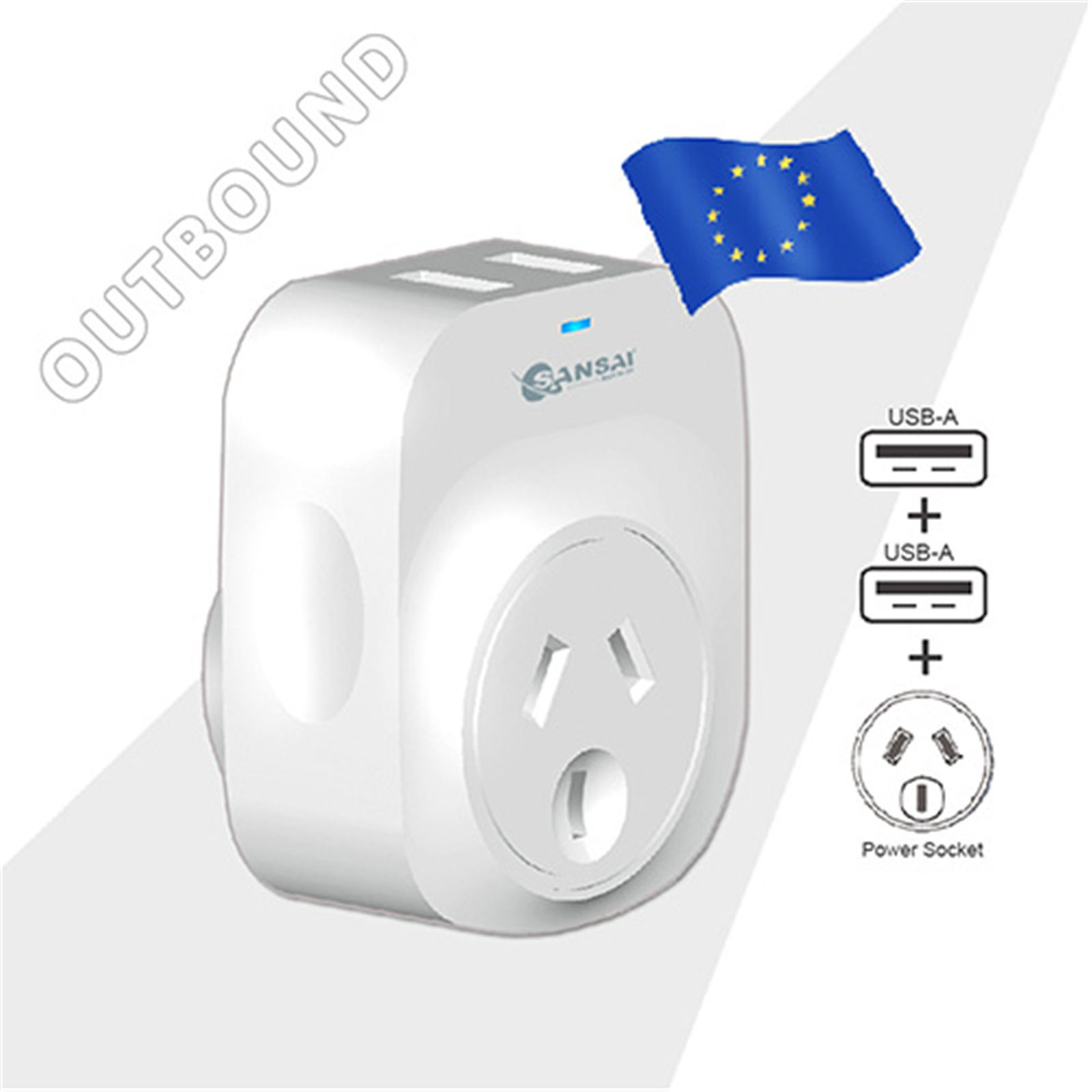 Sansai STV-3010 Outbound USB Travel Adapter - NZ / AU to Europe Plug USB-A - EU & Bali - 2x USB-A Fast Charge Ports (2.1A)