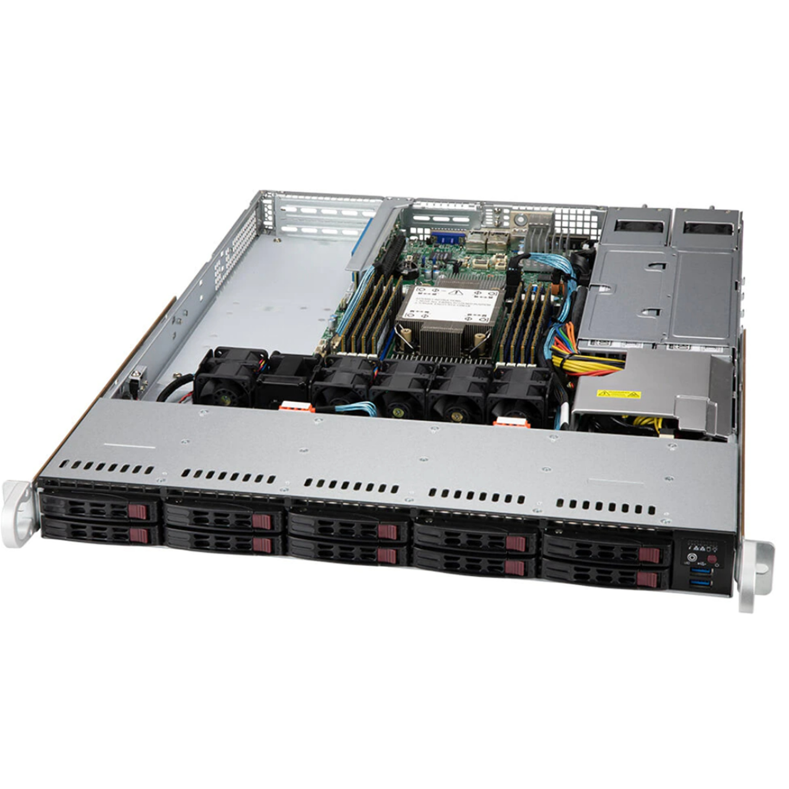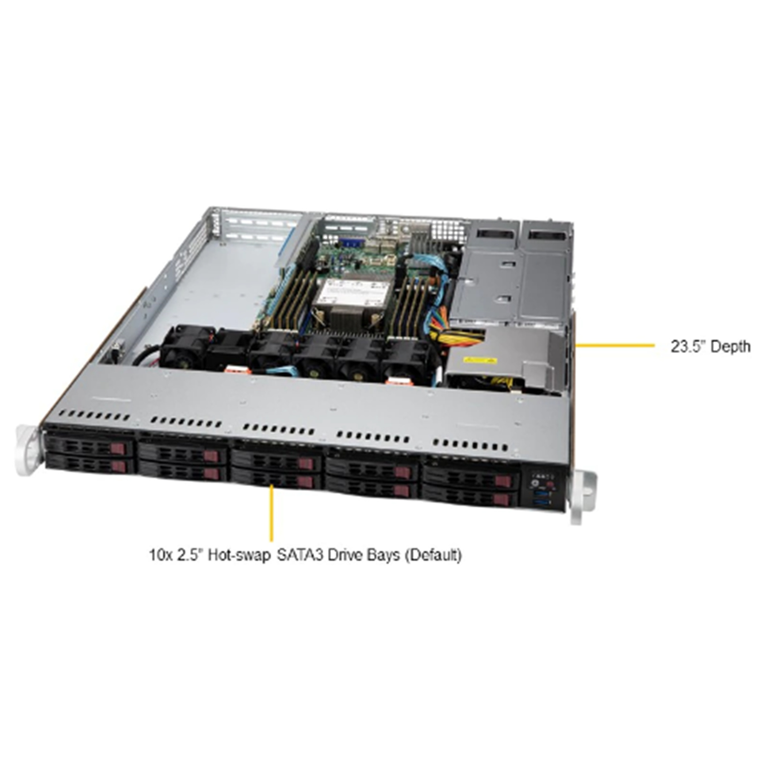- 10x hot-swap 2.5'' SATA3 drive bays with 4 hybrid NVMe/SATA drive bays, SAS3 with additional SAS controller card; Onboard 1x NVMe/SATA M.2