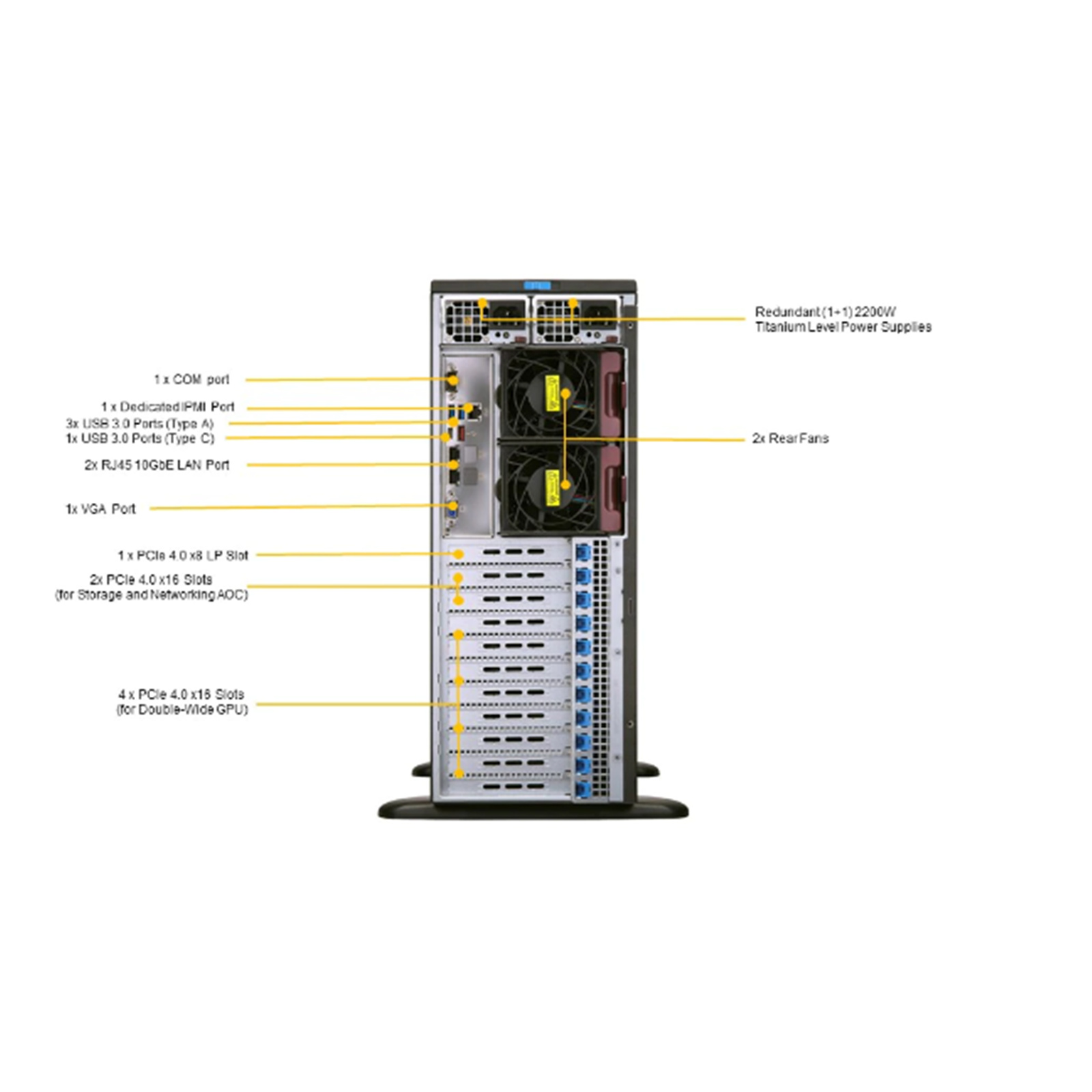 4 PCI-E 4.0 x16 (double-width) slots, 2 PCI-E 4.0 x16 (single-width) slots,