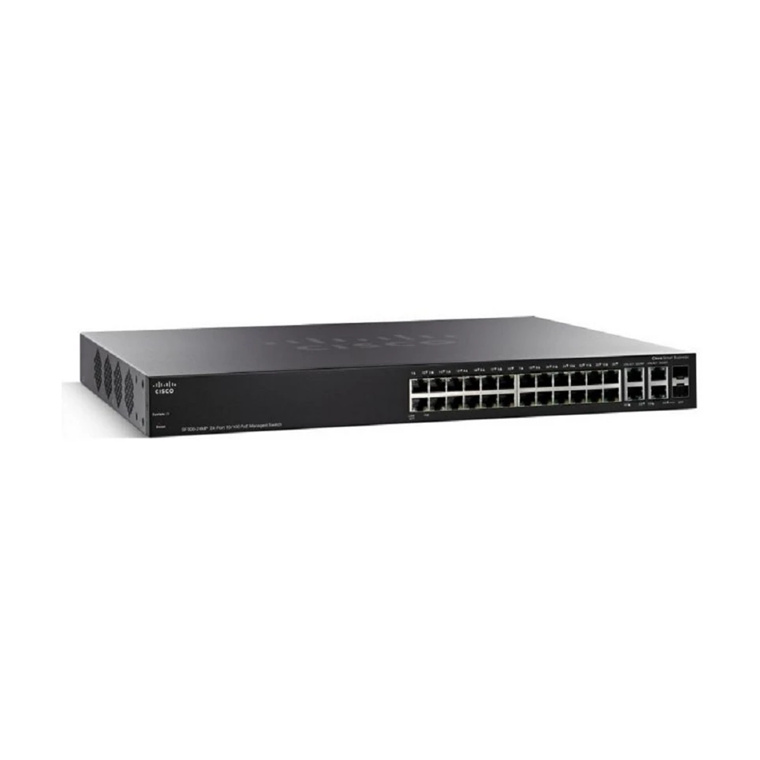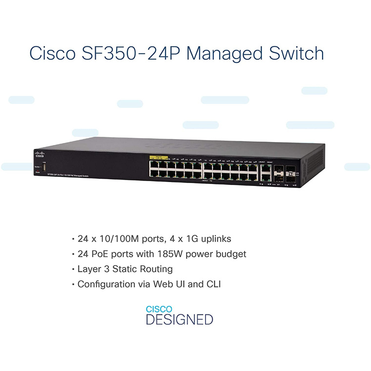 Cisco 350 Series SF350-24P L3 Managed Switch, PoE+, 24 Ports 10/100, (24 Ports PoE+, Max 185W), 2 Ports SFP, 2 Ports GbE Combo RJ-45 or SFP, Limited Lifetime Warranty