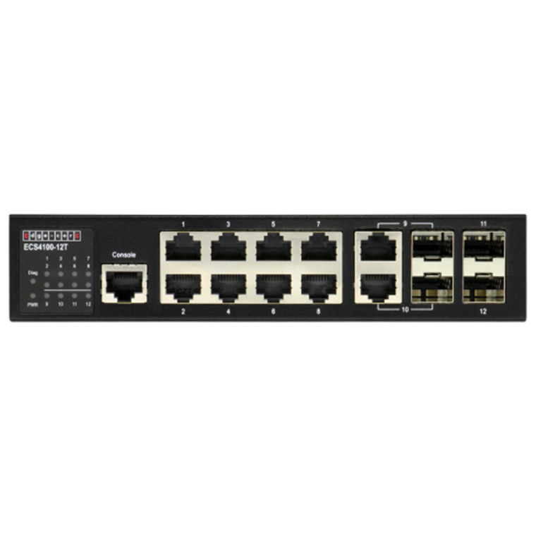 EDGECORE ECS4100-12T 8 Port + 2 Combo + 2 SFP Gigabit Managed Switch. 2 Combo Gig + 2 100/1000 SFP ports. 1x RJ45 Console port. Comprehensive QoS, Enhanced Security with Port security limits.