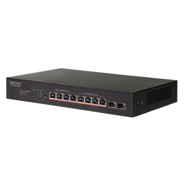 The ECS1100-10HP is a rack-mountable switch and supports 802.3bt PoE Type 4 with Power Class 8, enabling a maximum power transfer from Power Sourcing Equipment (PSE) to Powered Device (PD) of up to 90W.