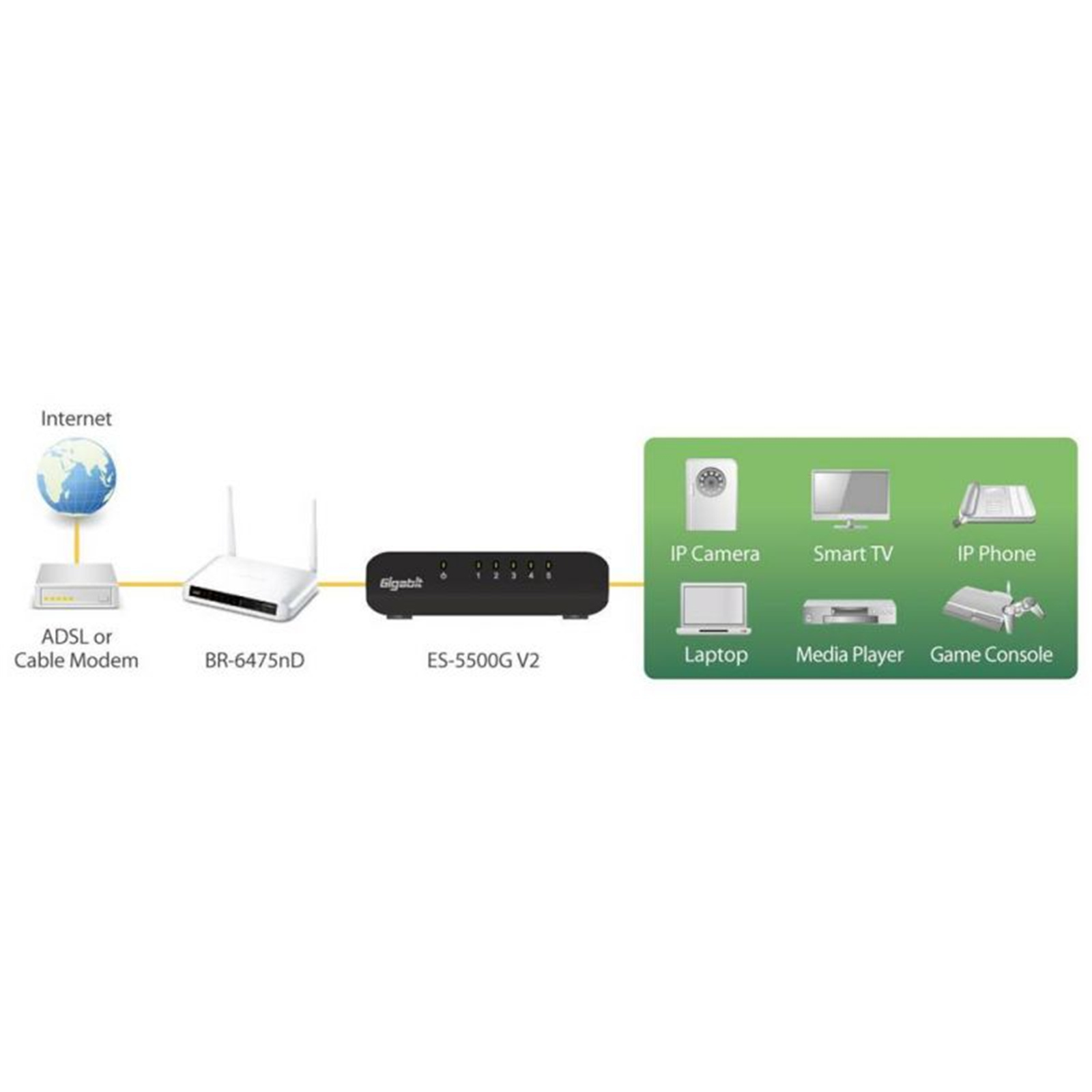 - Connect a print server, NAS, smart TV, laptop, media player, game console and/or IP Camera to the ES-5500G V3.