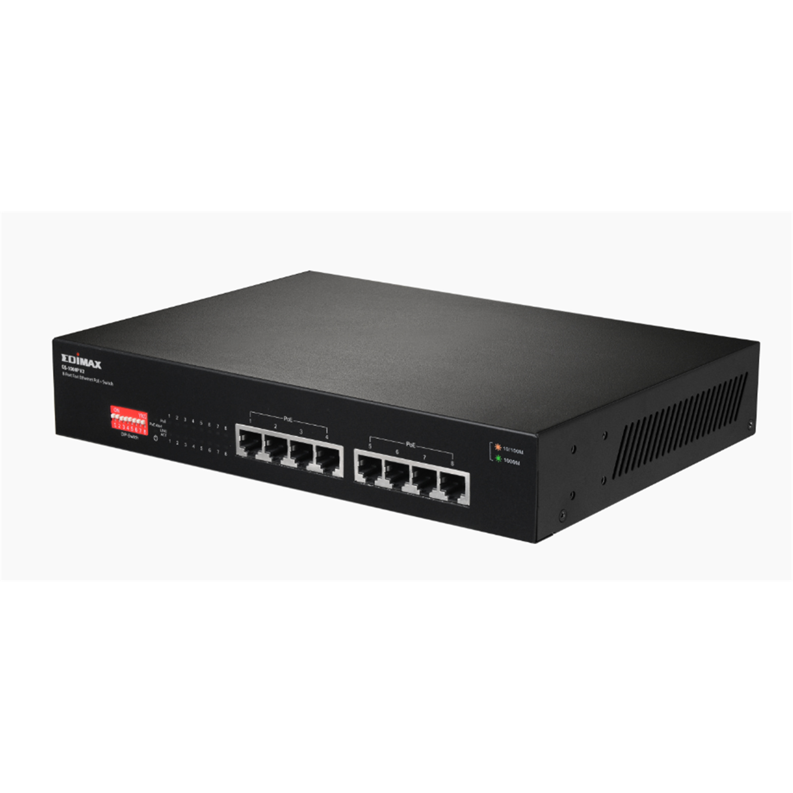 Edimax GS-1008PV2 8 Port 10/100/1000 Gigabit PoE+ Switch with DIP Switch. PoE delivery up to 200m. Power budget: 130W. Auto Energy Saving. Functions. Plug and Play. VLAN and Loop Protection. VLAN & QoS.