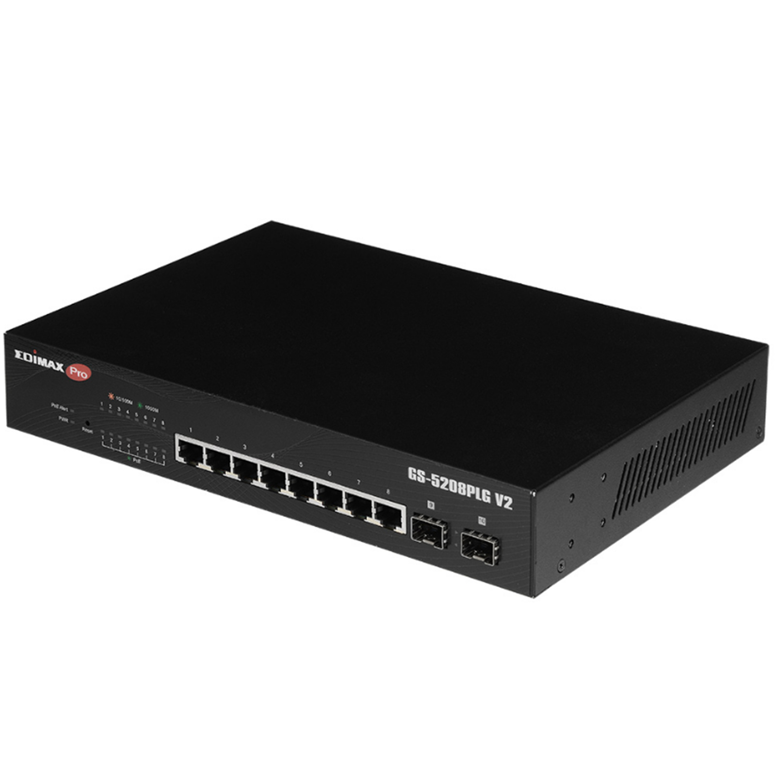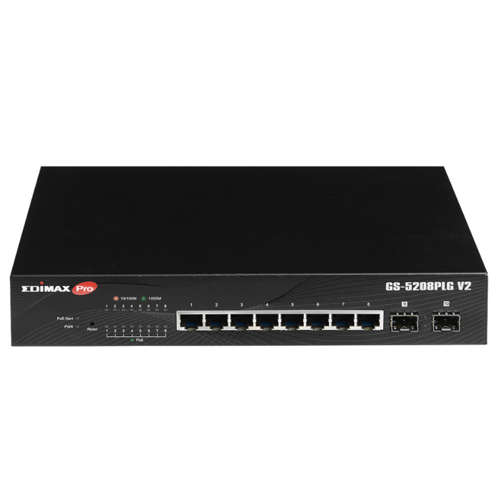 Edimax GS-5208PLGV2 10-Port Gigabit Long Range PoE+ Web Smart Switch with 2x SFP Slots. 8x POE Ports + 2SFP.IEEE 802.3af/at PoE/PoE+ Compliant Power Budget 84W. POE Support up to 200M.
