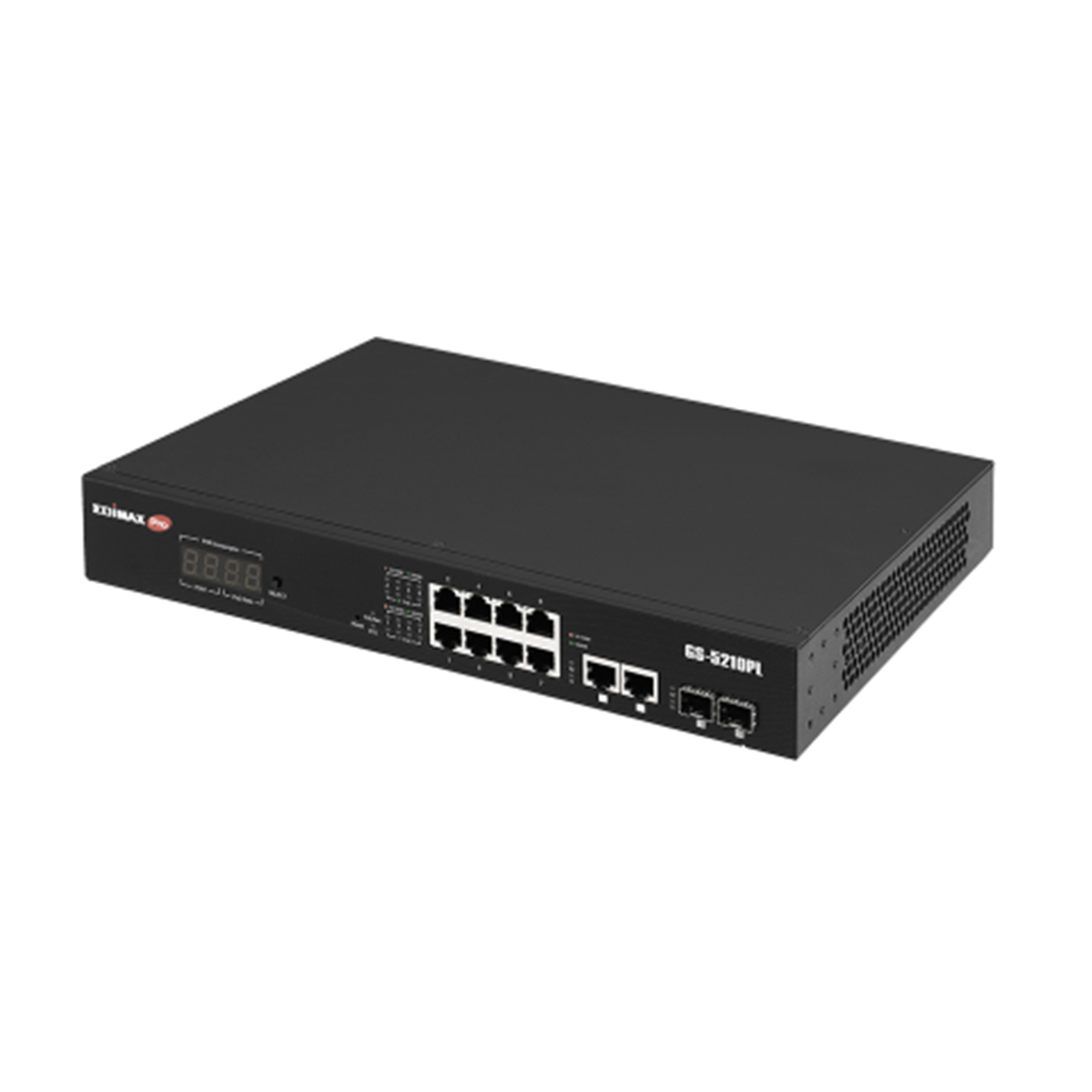 Edimax GS-5210PL 12-Port Surveillance Long Range Gigabit PoE+ Web Smart Switch with 2 Gigabit RJ45 & 2 SFP Ports. Max Power Budget 110W. Supports PoE up to 200m. IEEE 802.3af/at PoE Compliant. IP Surveillance VLAN