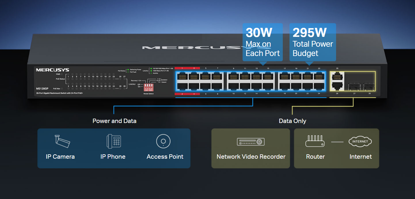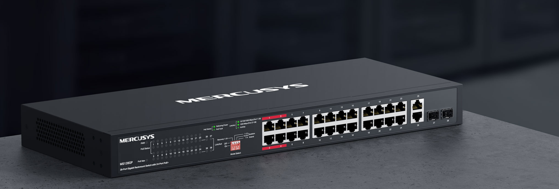 Mercusys MS128GP 28-Port Gigabit Rackmount Switch with 24-Port PoE+ (Max 295W), Long-Range Mode up to 250 m