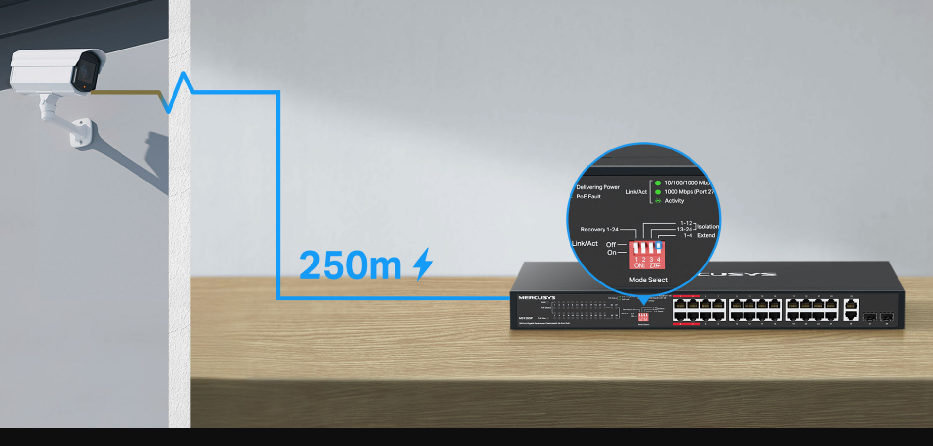- Long-Range up to 250 m: Increases PoE transmission distance to 250 m by Extend Mode**