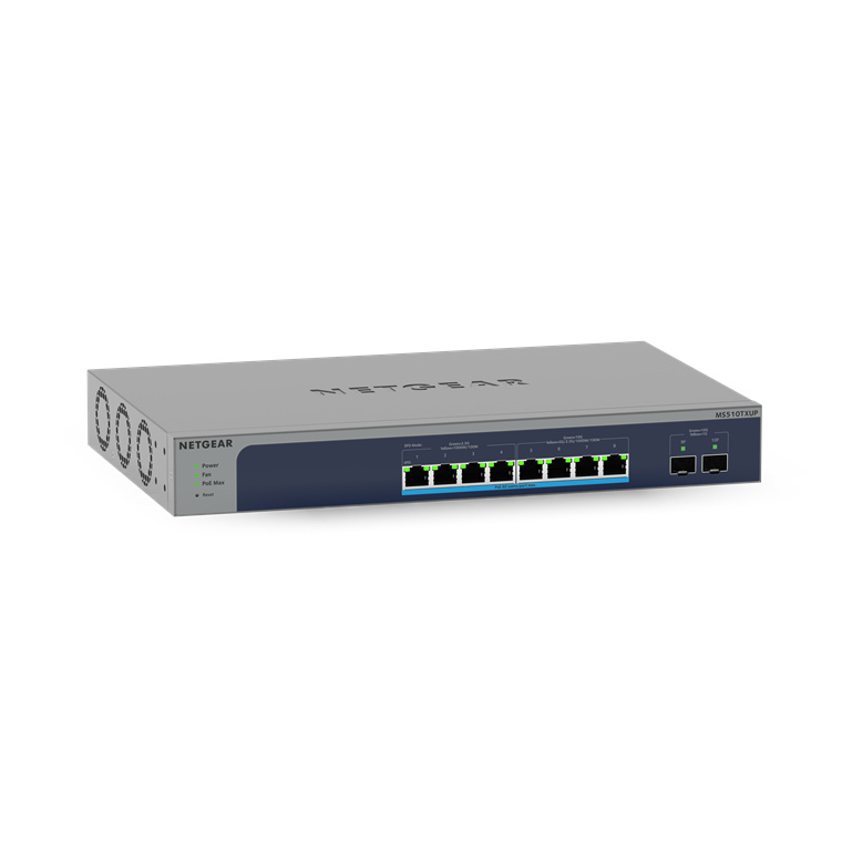 The MS510TXM and MS510TXUP 8-Port Multi-gig/10G switches with 2 SFP+ Ports join the NETGEAR Standalone Smart Managed Pro Switches family, adding multi-gigabit/10G speed, a high PoE budget for all PoE/PoE+ devices, and