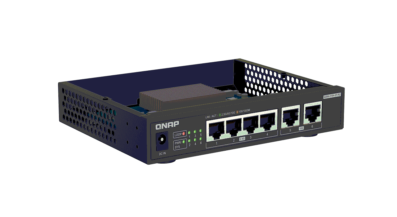 Upgrade now with the wallet-friendly compact 6-port high-speed switch! The QNAP QSW-2104-2T-R2 unmanaged switch with four 2.5GbE ports and two 10GbE ports allows you to upgrade to stable high-speed networking at an affordable price. Integrated seamlessly with Wi-Fi 6/6E/7 for optimal wireless network performance, the QSW-2104-2T-R2 is perfect for offices and multimedia teams, providing high-speed data transfer, large file sharing, and efficient collaborative workflows.