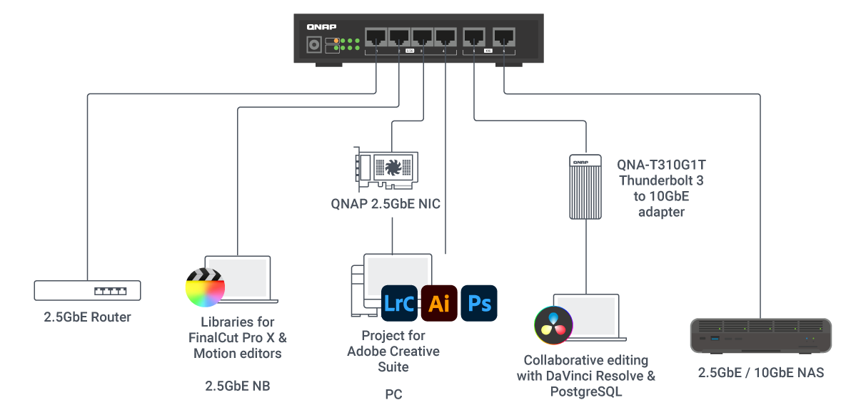 Setting up the QSW-2104-2T-R2 is as easy as connecting it to your NAS and workstations, immediately realizing a 2.5GbE/10GbE multi-user collaboration environment. High-speed access, sharing assets, and editing 4K/8K video files has never been easier, allowing you to focus on your work instead of managing a network.