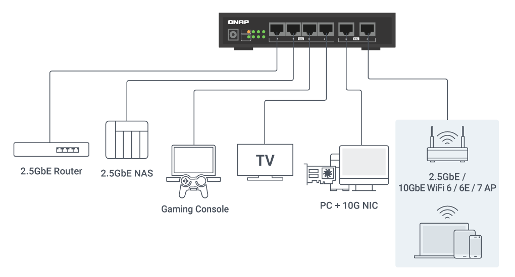 The QSW-2104-2T-R2 features 4x 2.5GBASE-T and 2x 10GBASE-T Ethernet ports, supporting NBASE-T™ technology and Multi-Gigabit standards to offer 2.5G / 1G / 100Mb and 10G / 5G / 2.5G / 1G / 100Mb speeds. The switching capacity of QSW-2104-2T-R2 is 60Gbps, guaranteeing the full potential of each connected device, including computers, laptops, NAS, and Wi-Fi 6/6E/7 access points. The QSW-2104-2T-R2 is perfect for use in offices, small/medium-sized businesses, and video studios requiring high-speed networking for seamless file transfers, high-speed backups, virtual machine applications, or multimedia content creation and sharing. Connect to TV boxes or gaming consoles in homes to enable faster and smoother entertainment.