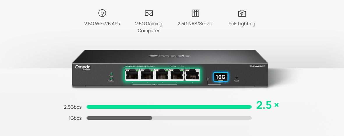 Omada 5-Port 2.5GBASE-T and 1-Port 10GE SFP+ Easy Managed Switch with 4-Port PoE++