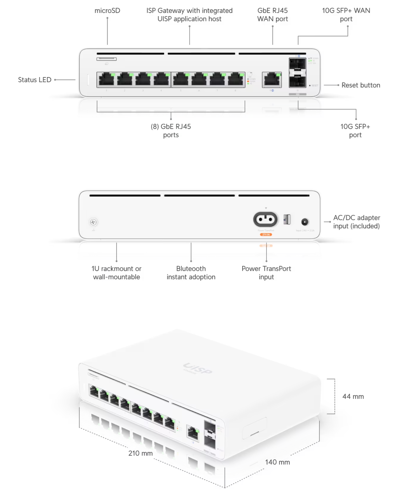 UISP Console is a high-performance gateway with (2) ber-ready SFP+ ports and (9) Gigabit RJ45 ports. It natively supports dual-WAN ports: (1) 10G SFP+ and (1) Gigabit RJ45, and has a built-in switch with (8) Gigabit RJ45 ports.