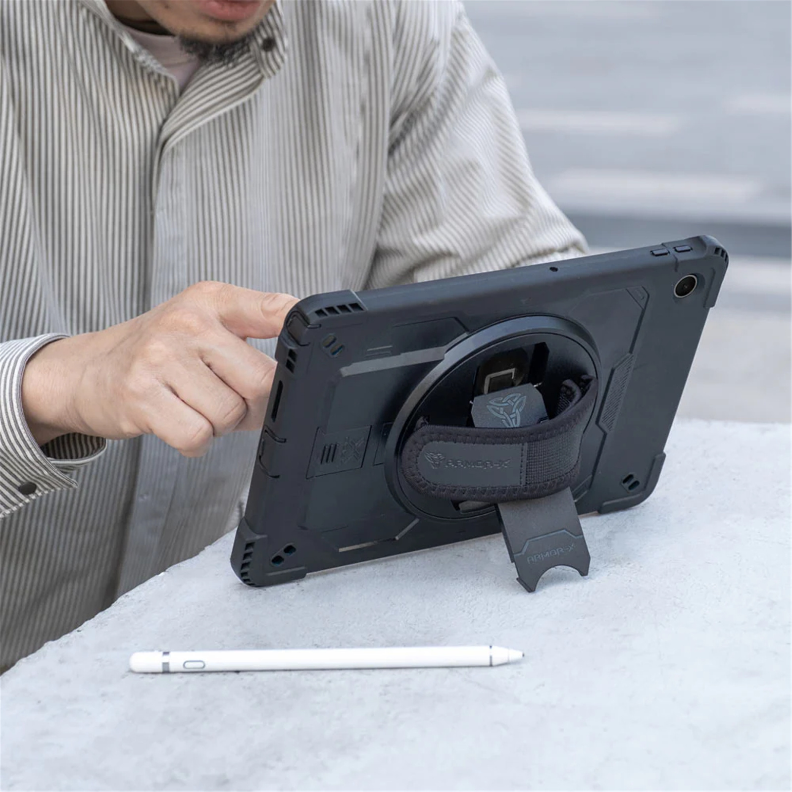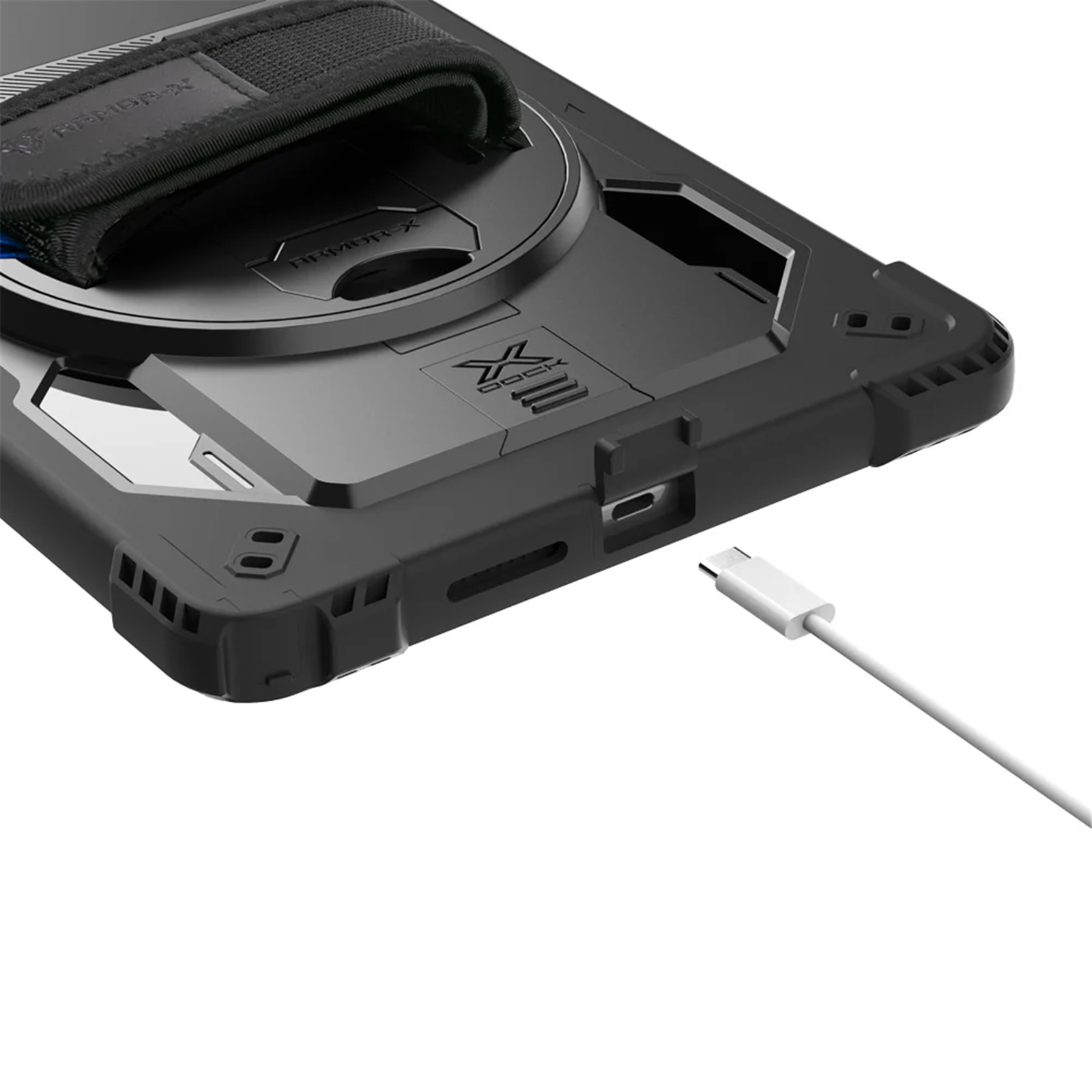 Our protective case comes with a built-in hand strap, kick-stand and X-DOCK interface. It provides the best functionality for our end user to use their tablet securely.