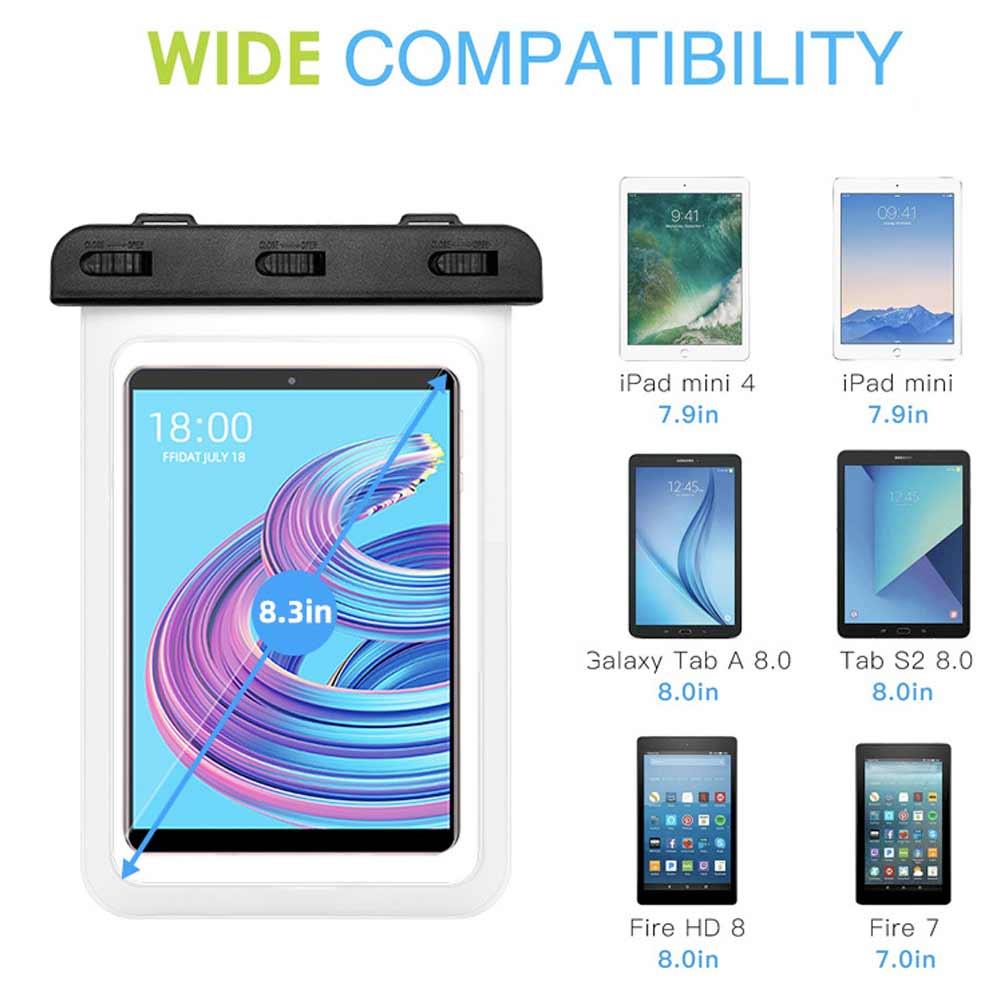 - Fits all tablets up to 8.3 inches, perfect for swimming, boating, kayaking, snorkeling and water park activities.