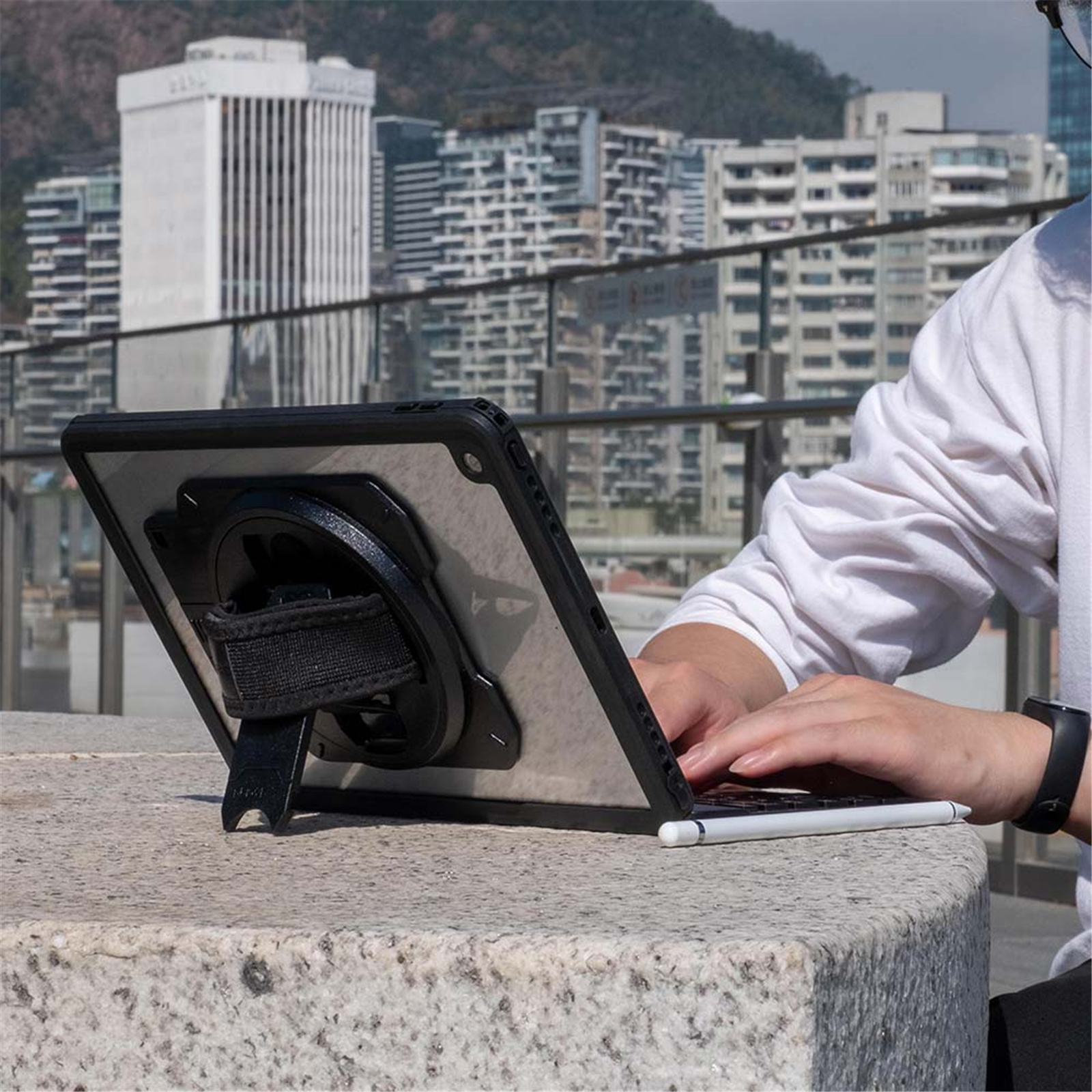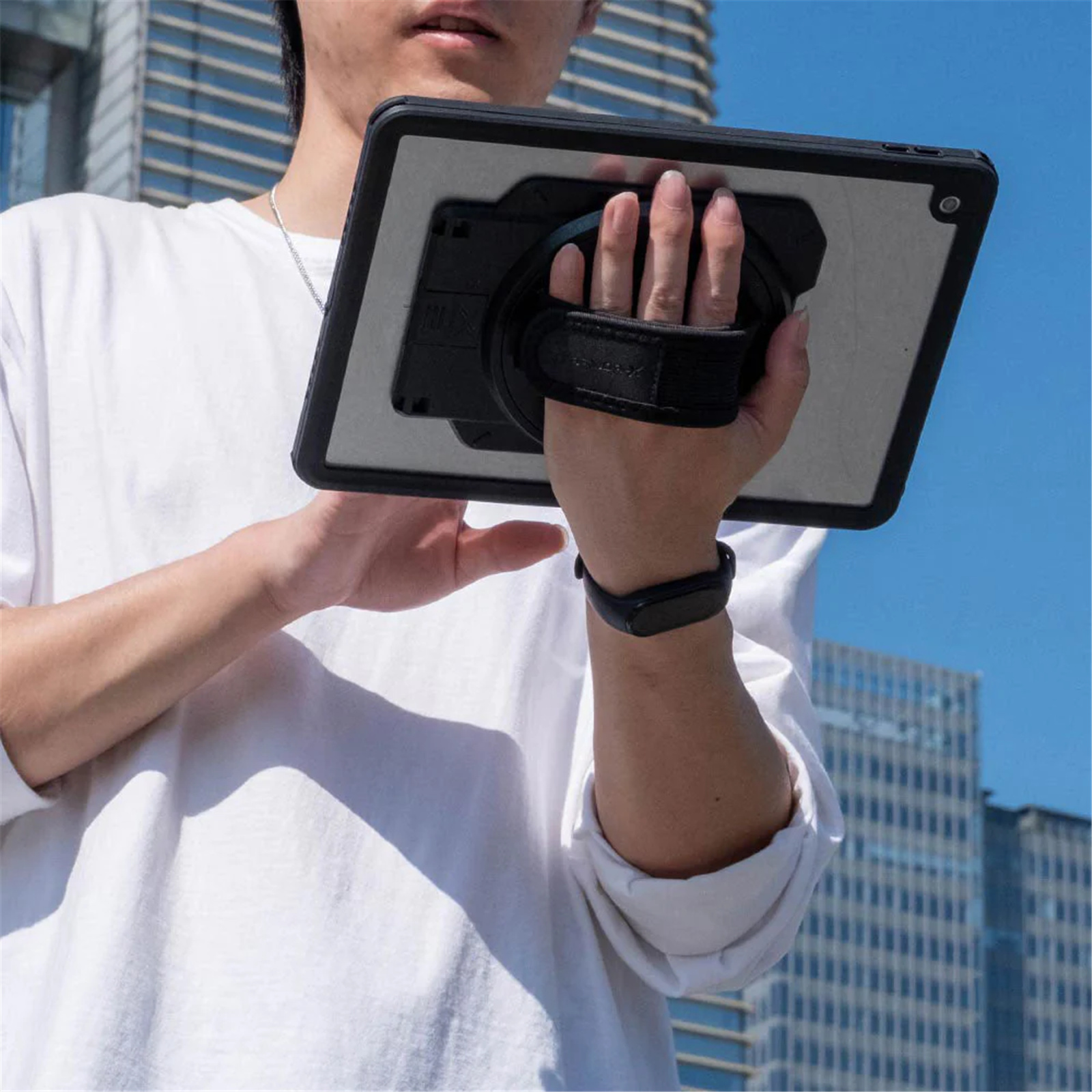 Our protective case comes with a built-in hand strap, kick-stand and X-DOCK interface. It provides the best functionality for our end user to use their tablet securely.