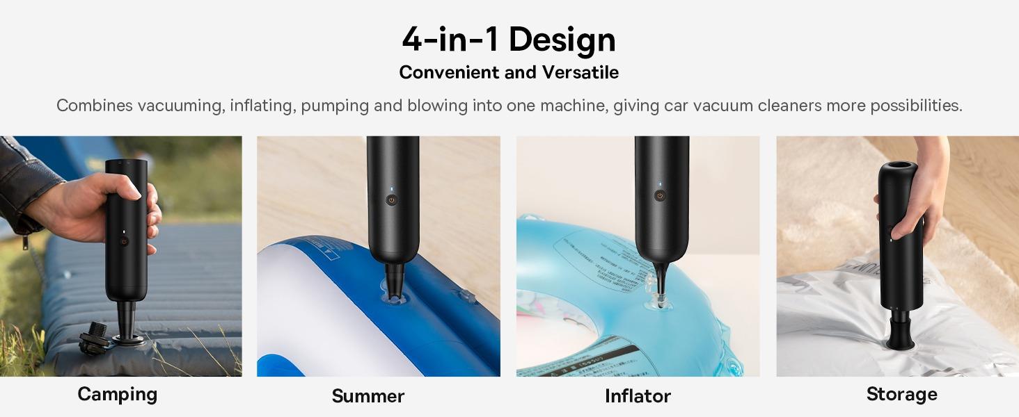 4-in-1 Small Vacuum With Multi-purpose Use: It's a vacuum cleaner, an air pump, an inflator and a blower in one design. Come with 4 universal nozzles, suitable for most small-large sized inflatable products, such as air mattresses, inflatable beds, pool floats, sleeping pads, swim rings, inflatable furniture, pool inflatables and other inflatable toys