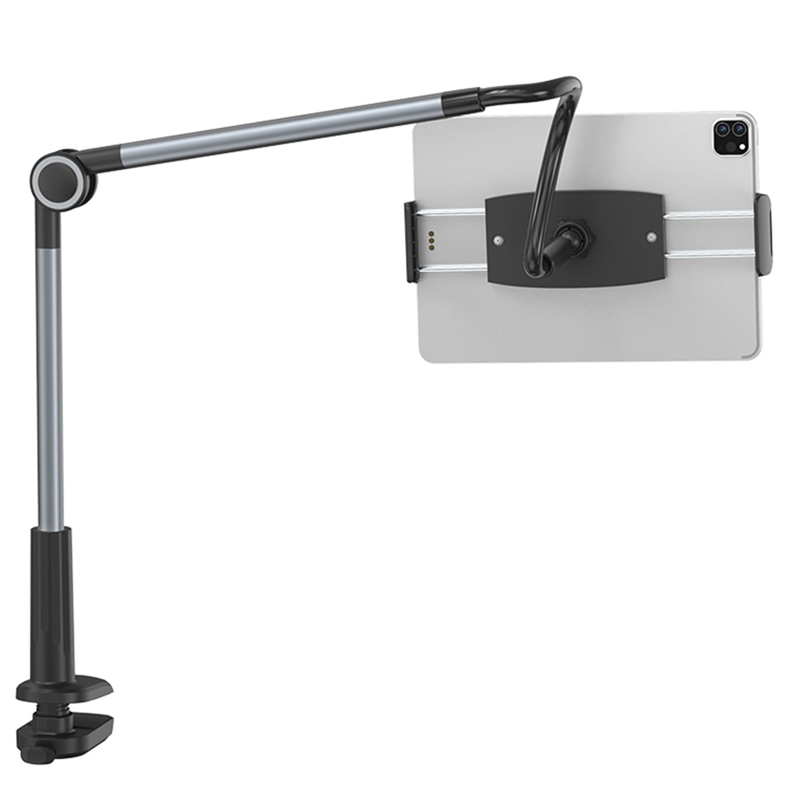 It has a 360-degree adjustable base with free bending. It is compatible with 4.7-12.9 inches of equipment. Its double-section alloy rod and firm clamping hold your devices in place without falling, or downward hanging. You can easily clamp it onto furniture without damaging the surface. It can be clamped on wood, glass, and cylinder-shaped objects.