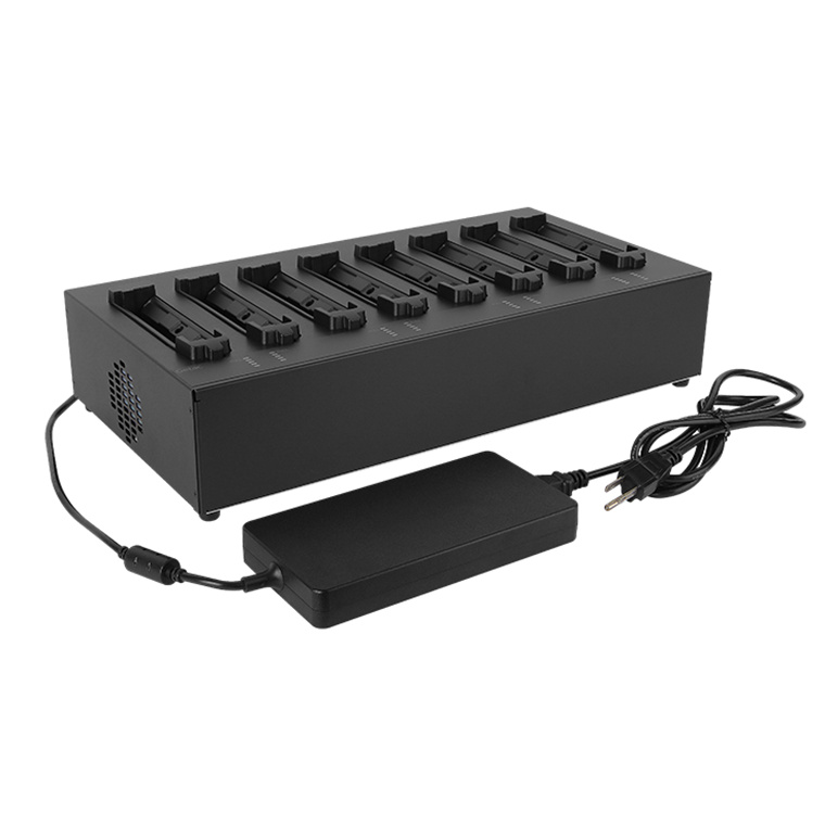 With eight individual battery bays, this charger stands out in its ability to support bulk charging. It is designed to handle both standard main batteries and larger, high-capacity batteries, meeting the diverse needs of various industries including field operations and emergency services.