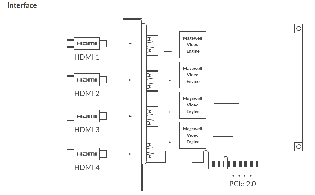 The Magewell Pro Capture Quad HDMI is a high-performance PCIe capture card designed to simultaneously capture video from up to four HDMI sources. This capability makes it an ideal solution for applications requiring multi-channel video capture, such as live streaming, broadcasting, and video conferencing. The card supports input resolutions up to 2048×2160 pixels, ensuring compatibility with a wide range of video formats.