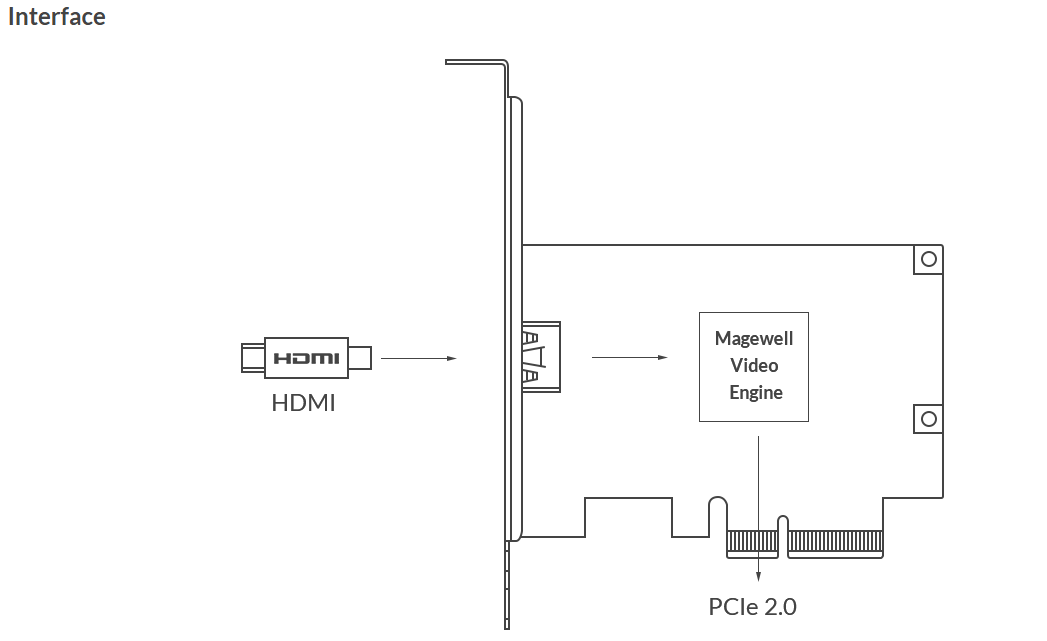 The card features a single HDMI input interface, compatible with HDMI 1.4 and DVI-D 1.0 standards. This allows for versatile connectivity with various video sources. The host interface is PCIe Gen2 x4, ensuring high-speed data transfer and minimal latency during video capture.