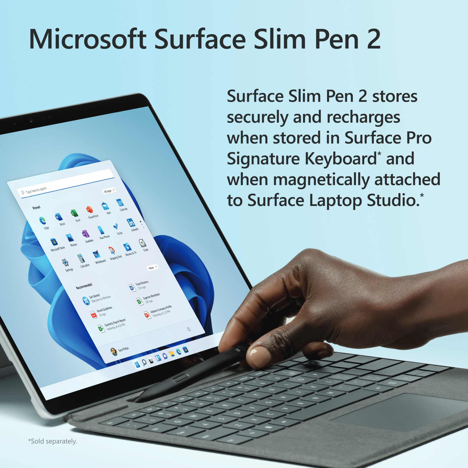 You'll always know where the Surface Slim Pen 2 is with built-in, wireless charging and secure storage in Surface Pro Signature Keyboard 2 or Surface Laptop Studio.[2]