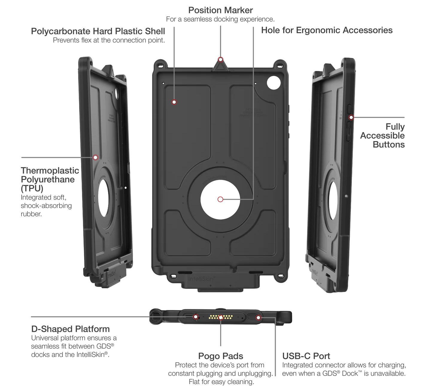 A key advancement in the Next Generation model lies in the newly designed ruggedized contacts. These contacts, now positioned flat on the exterior of the case, allow for easier cleaning and significantly reduce the accumulation of dust and dirt compared to traditional designs. This makes the IntelliSkin® sleeve especially ideal for users who frequently dock and undock their devices in various demanding environments, as it streamlines maintenance while supporting greater durability.