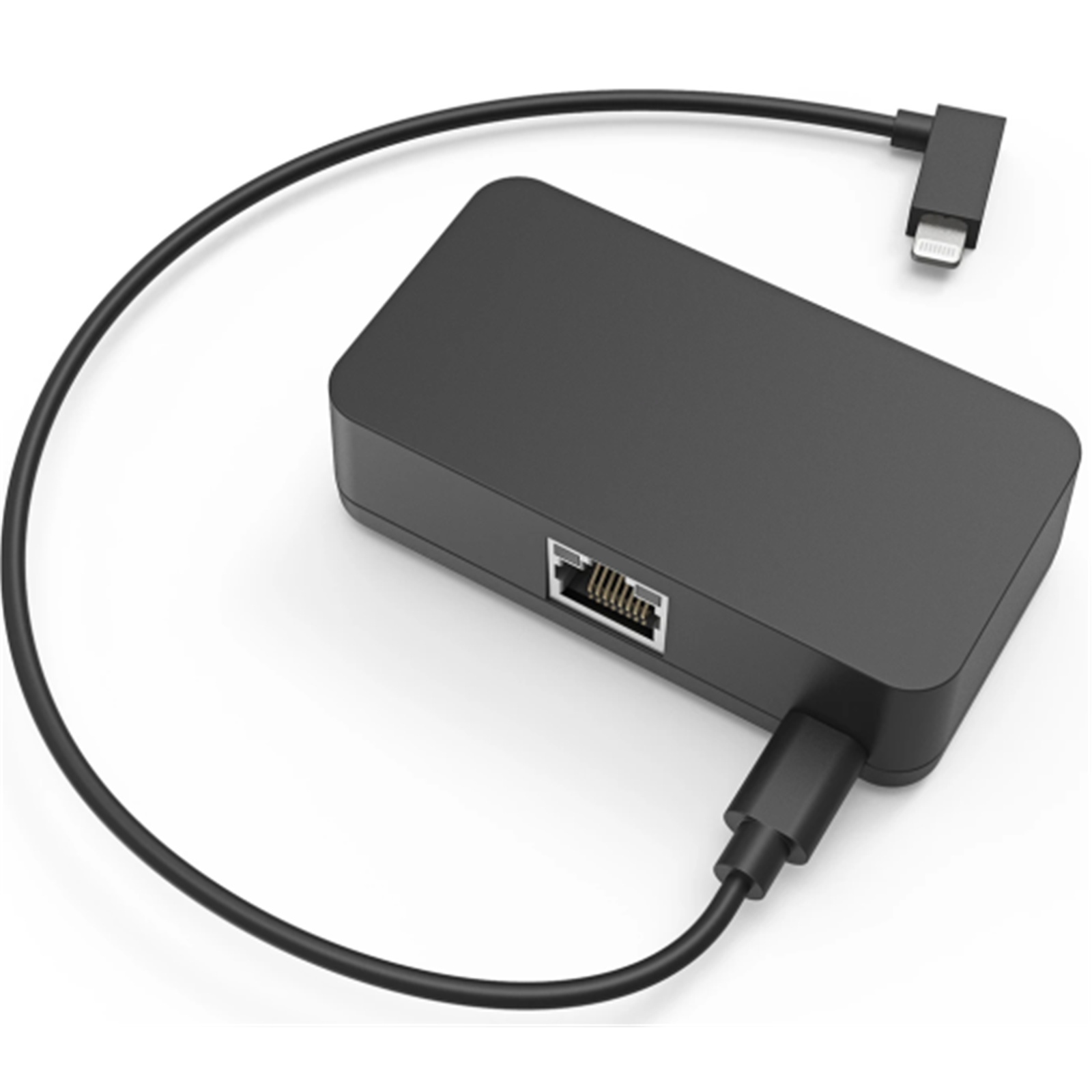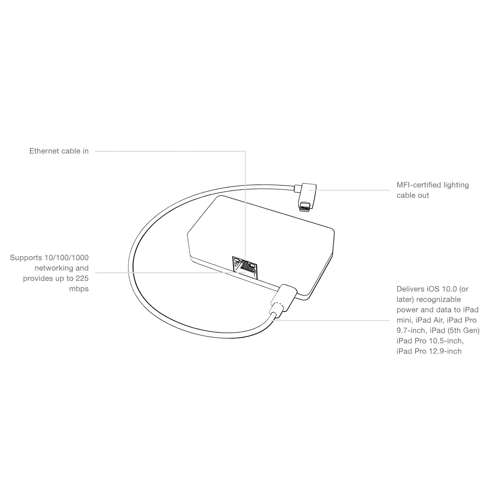 The Redpark Gigabit + PoE Adapter connects iPads and iPhones to ethernet and uses power over ethernet (PoE) to charge the device. This enables an iPad to receive both data and power over a single Ethernet cable when connected to a PoE-enabled switch or PoE injector. This iPad ethernet adapter is instantly recognized as a network connection. The ethernet connection is available for use by any iOS app and can be configured using the 'Settings' app on the iPad (iOS 10.0 or later required). The adapter physically connects to the iPad or iPhone using the included Lightning to USB Micro B cable. It supports 10/100/1000 networking and provides bandwidth up to 225 Mbps.