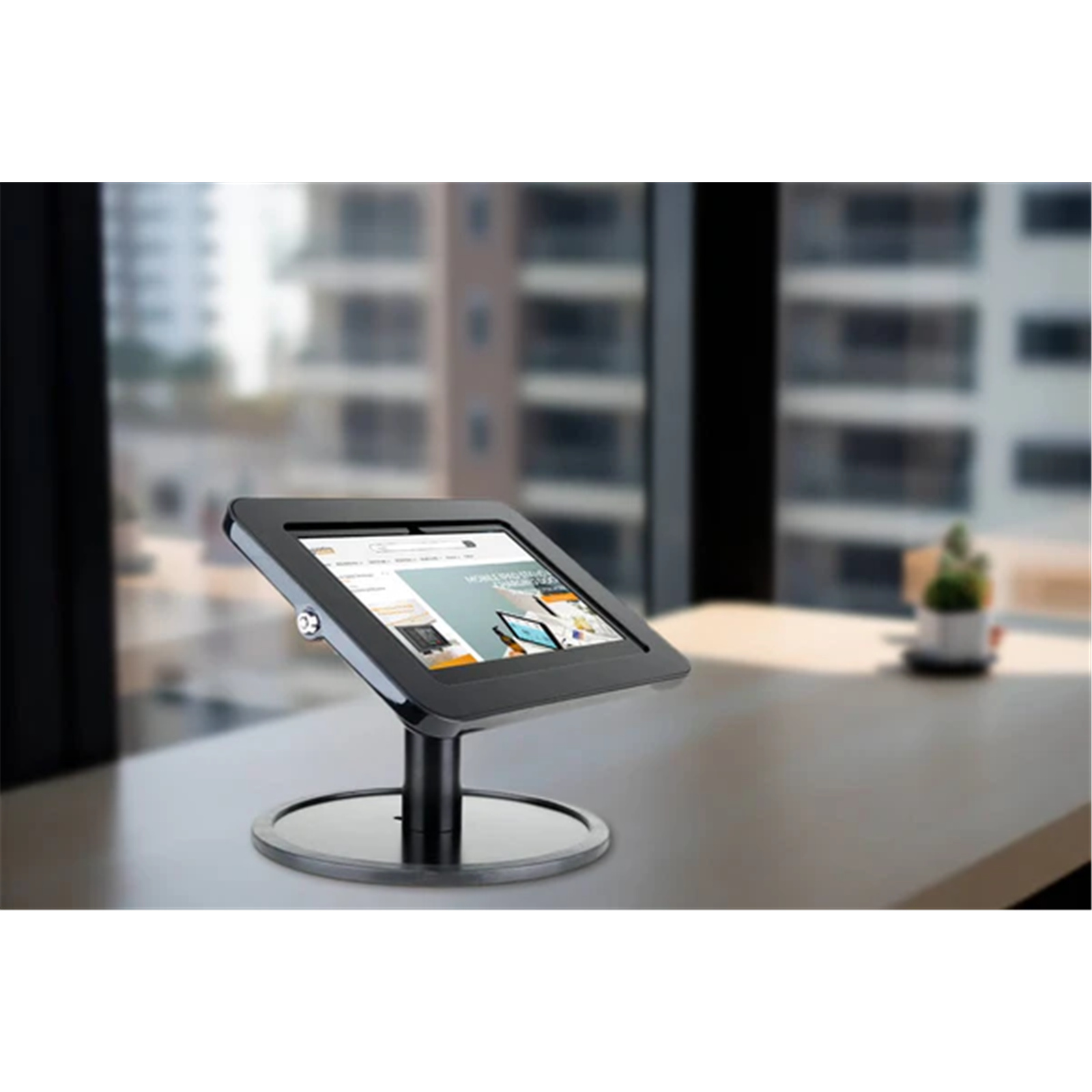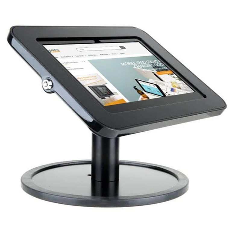 This iPad table-top-mounted solution allows you to use your iPad for a range of business applications. The freestanding base allows for stable movement and repositioning, perfect for temporary displays or for surface that won't tolerate drilling of holes.