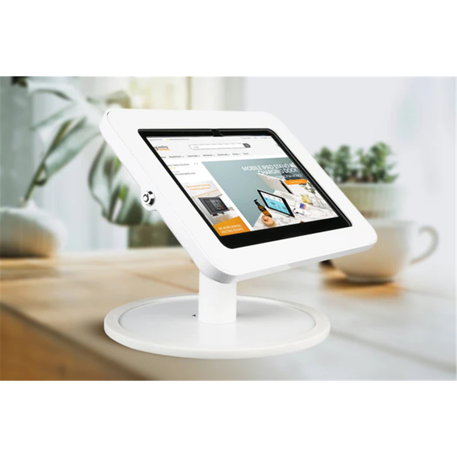 This iPad table-top-mounted solution allows you to use your iPad for a range of business applications. The freestanding base allows for stable movement and repositioning, perfect for temporary displays or for surface that won't tolerate drilling of holes.