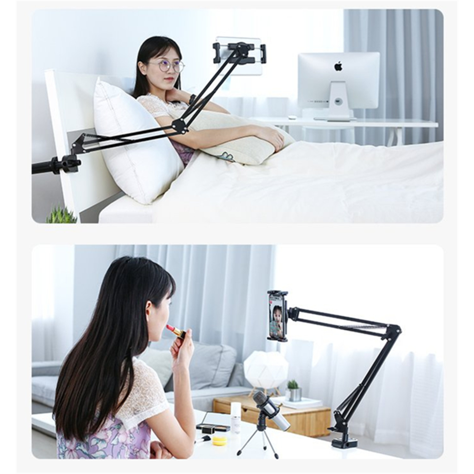 Made of the 360-degree rotation joint, 2-stage and 180° & 135° adjustable sturdy steel arms with a total 750mm length, this flexible tablet phone mount is easy to grab your device, twist it, raise it, turn it sideways or any direction you like.