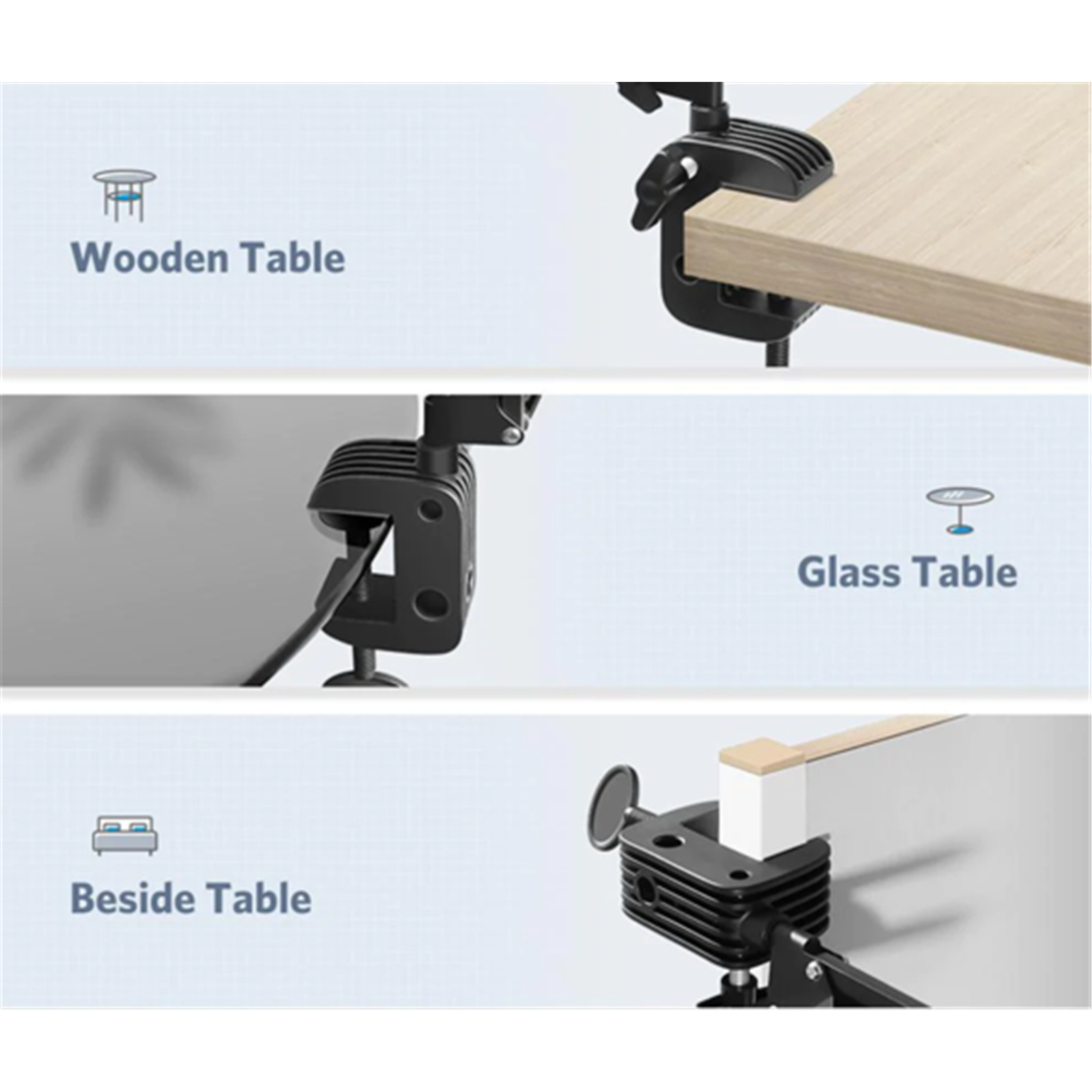 UGREEN premium 360-degree adjustable lazy holder can let you conveniently view your devices at the ideal distance and angle when you are lying, eating, reading, cooking, typing, writing, watching movies, or playing games. It can firmly clamp the chair, tablet, wall cabinet desk, and bed headboard with 1-3" thickness.