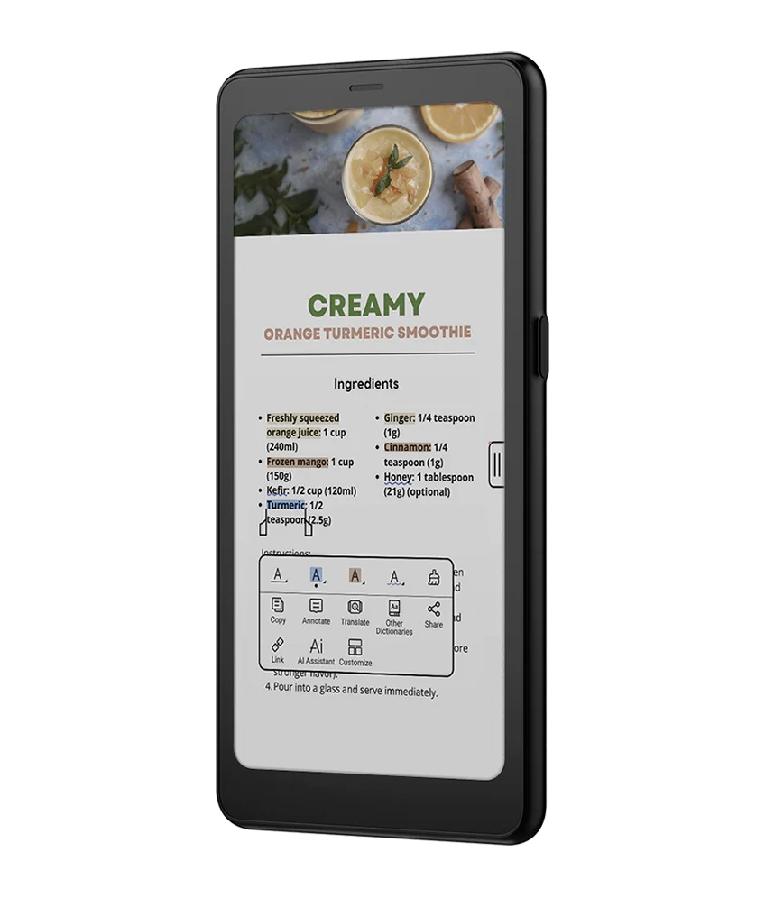 The Kaleido 3 color display does not emit blue light like traditional backlit screens. It is readable under direct sunlight and shows a newspaper-like color tone.