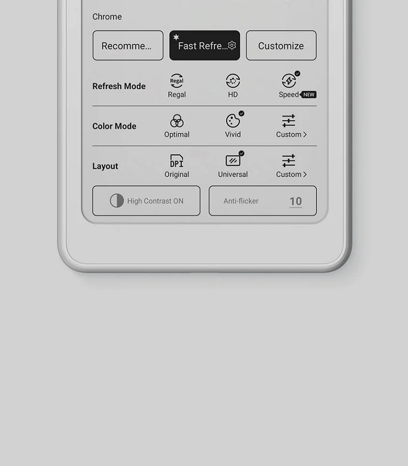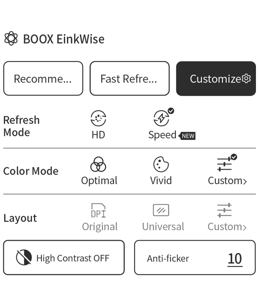 Quickly switch to a preset display mode for web browsing, reading, or app use with EinkWise. Customize each preset with your preferred settings for refresh mode, color mode, and layout.