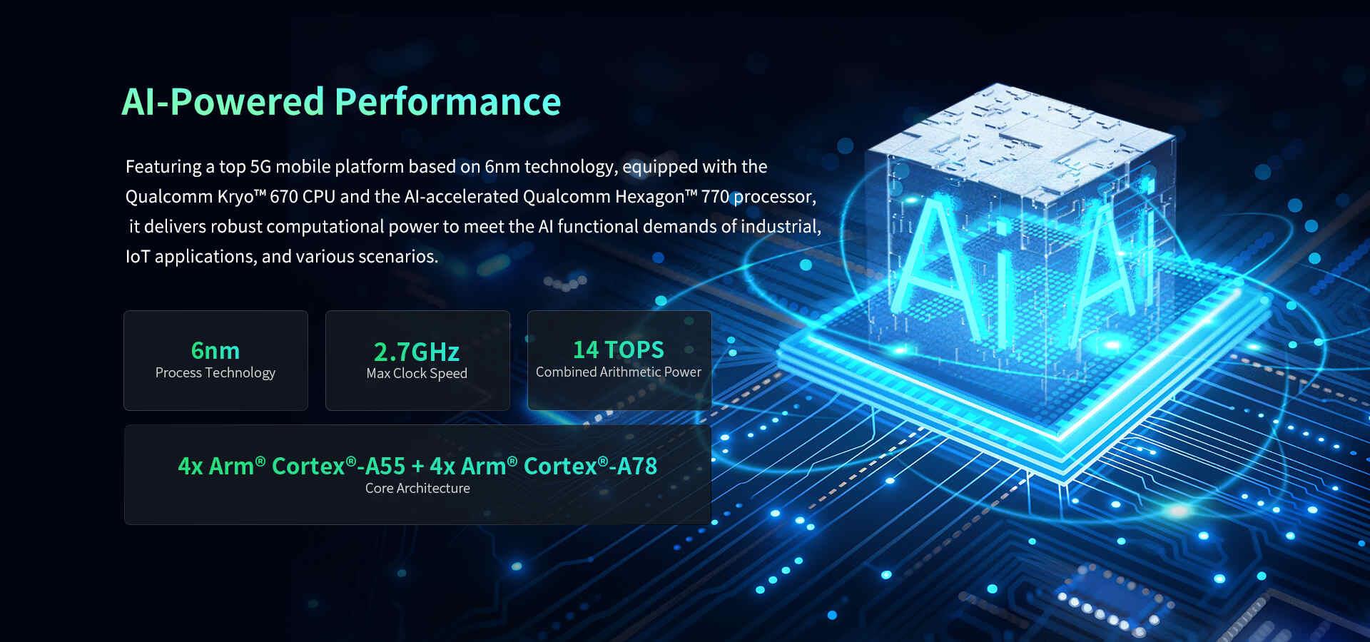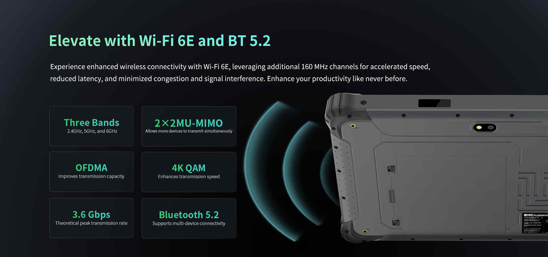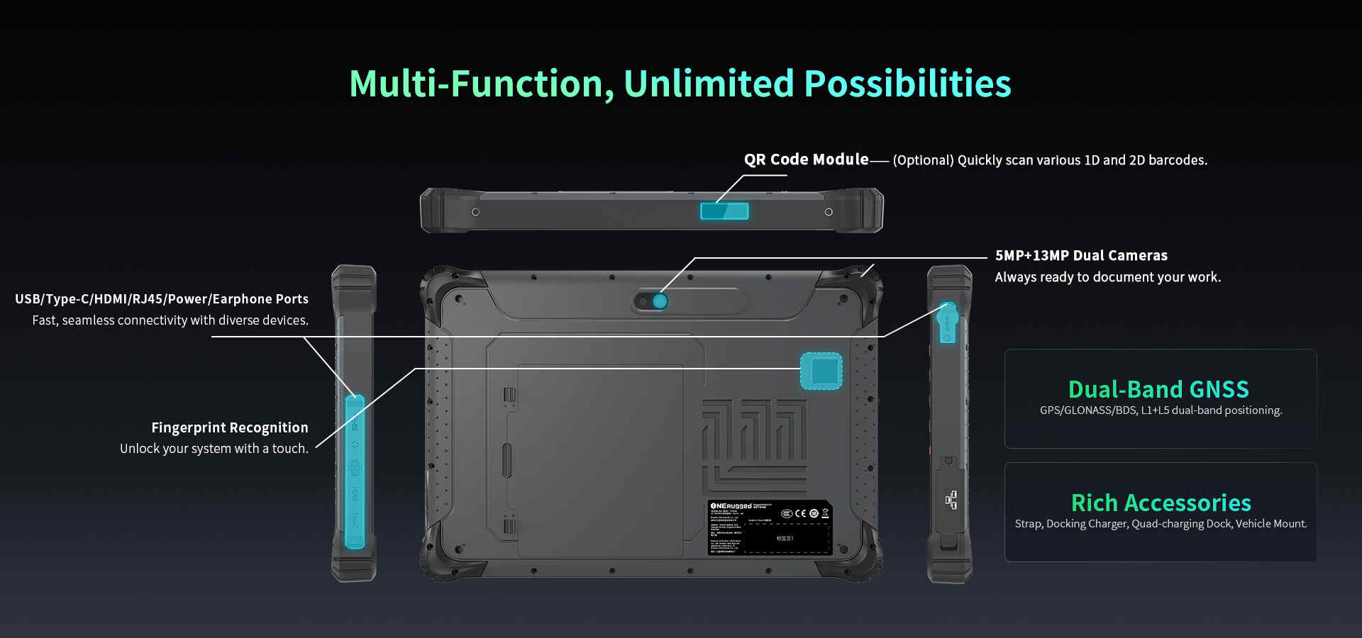 The ONErugged M105Q is a formidable rugged tablet PC engineered to conquer any task with AI-powered performance. Built by ONErugged, this 10.1-inch device leverages a top 5G mobile platform based on 6nm technology, featuring the Qualcomm Kryo 670 CPU and AI-accelerated Qualcomm Hexagon 770 processor. Running Android 14 (GMS certified), it delivers robust computational power for industrial IoT applications and diverse scenarios.