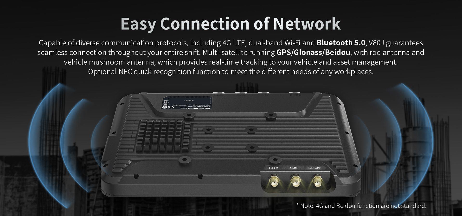 4G LTE, dual-band Wi-Fi, Bluetooth 5.0 and GPS/Glonass/Beidou functions, with available vehicle mushroom antenna.