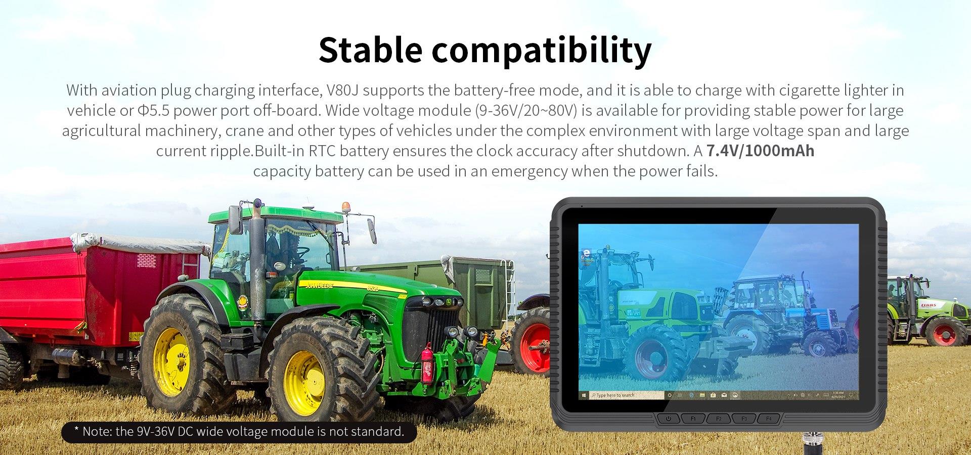 V80J is a 8-inch vehicle pc, which is specially designed for in-vehicle applications. Equipped with Intel® 11th Gen Celeron® N5100 processor, it is more powerful, and its integrated Wi-Fi-5, 4G LTE and GPS functions support available vehicle mushroom antennas, the coverage area is larger and the signal reception is better. Moreover, it has passed the dustproof, waterproof, anti-vibration and wide temperature tests, and with the M12 aviation plugs, wide voltage module, VESA and RAM mounting methods, etc., it can keep stable at all times and can meet all vehicle types, like forklifts, cranes, trucks.