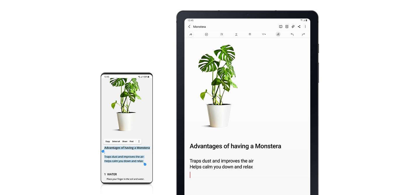 Seamlessly work across devices. You can copy text or an image from your phone and paste it on your tablet, and vice versa. Or write a note to self in Samsung Notes or browse on Samsung Internet from your tablet, and open those apps in your phone to pick up where you left off.