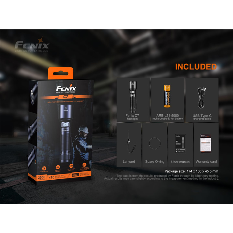 The Fenix C7 is a high-performance rechargeable flashlight for industrial maintenance and operations. It features USB Type-C charging with the included 5000mAh rechargeable Li-ion battery. Delivering an output up to 3000 lumens flashlight in turbo mode while throwing its beam a distance up to 470 meters, and the runtime reaches 68 hours when used on Eco mode. The magnetic base is perfect for hand-free use, to attach the flashlight to a nearby metal surface. The Fenix C7 LED flashlight is an excellent tool you can't miss, to be a good pal in kinds of outdoor activities or to use in kinds of industrial workplaces.
